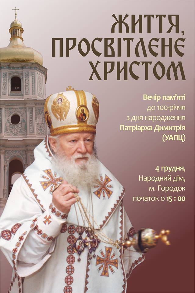 03.12.2016У неділю, 4 грудня, запрошуємо краян на вечір пам’яті з нагоди 100-ліття від Дня народження Патріарха Димитрія (УАПЦ). Початок о 15:00 год., Народний дім у м.Городку.