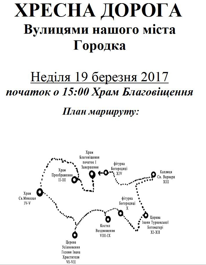 Також звертаємось до городківчан: будьте господарями у своєму місті, приберіть належно свої подвір’я та територію біля них, аби було не соромно йти його вулицями від храму до храму на Хресній дорозі (карту маршруту додаємо).
