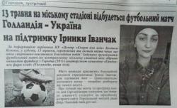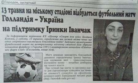 Коли про потребу Іринки дізнався Володимир Бевх (що мешкає у Голандії) то відразу запропонував благодійну ініціативу – провести благодійний футбольний матч 13 травня між FCEindhovenAV (аматорський клуб від ФК Ейндховен ) та командою ветеранів ФК Колос (Городок). Усі зібрані кошти (як напередодні у Голандії ) так і зібрані від реалізації квитків під час проведення матчу будуть передані батькам Іринки Іванчак.