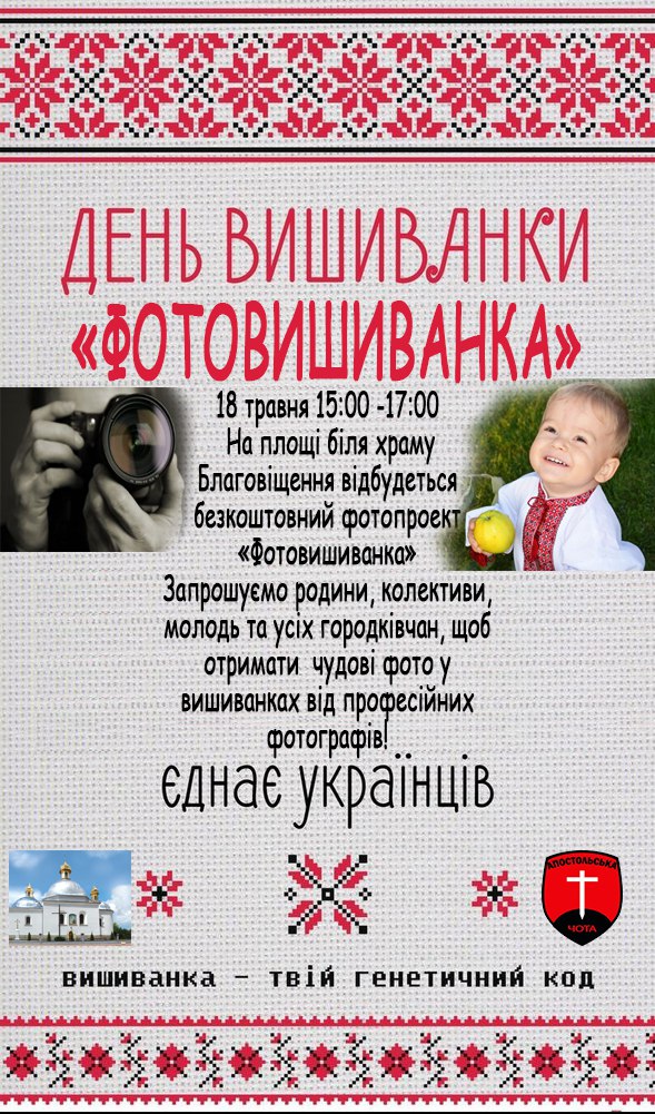 Анонс: "Апостольська чота" організовує День вишиванки - "Фотовишиванка"! Приходьте 18 травня!