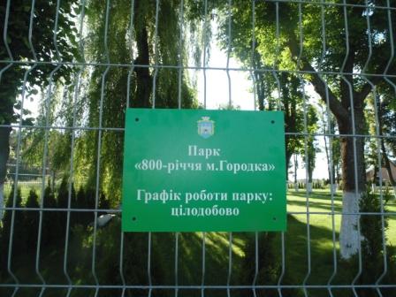 Сьогодні на фронтальній частині металевої огорожі міського парку 800-річчя Городка встановлено вивіску, яка засвідчує, що парк працюватиме цілодобово.