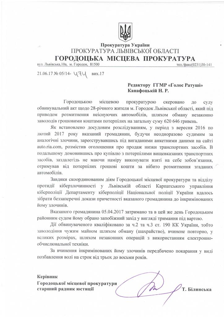 Так, городківчанину загрожує позбавлення волі на строк від 3 до 7 років... Про це вже написали місцеві ЗМІ. Також до Вашої уваги – офіційний лист Городоцької місцевої прокуратури Тетяни Білинської на адресу редактора газети Городоцької міської ради «Голос ратуші» (у якісному читабельному форматі можна переглянути, завантаживши прикріплений файл до цієї новини).