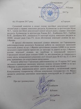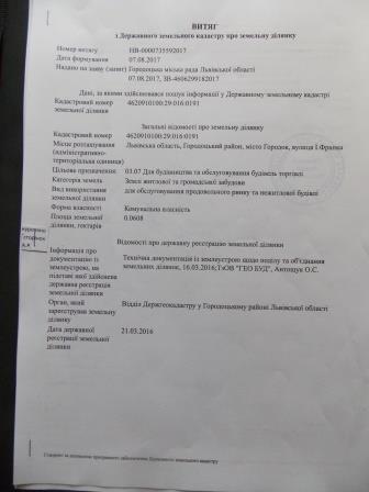 «Нагадаю, що між Городоцькою міською радою та колишнім продовольчим ринком КП «Газда-3» Городоцької райспоживспілки було заключено договір, термін якого минув 24.10.2016 року і депутатами Городоцької міської ради на сесії його не було продовжено. Є рішення міської ради №513 від 24.10.2016 року. З цього моменту дана земельна ділянка, площею 0, 681 га перебуває в комунальній власності громади міста. Це означає, що ця земельна ділянка мала б використовуватися на користь громади.Також сесією Городоцької міської ради торік було затверджено Генплан, в якому чітко передбачено, що дана площа має бути використана під автостоянку для автомобілів. Про це своєчасно було повідомлено керівника Городоцької РСС Б.Кориляка, та директора КП «Газда –з». Всі відповідні листи і документи перебувають у міській раді. Проте Городоцька райспоживспілка зігнорувала дане рішення і в грудні 2016 року заключила договори оренди з бізнесом щодо надання послуг для здійснення підприємницької діяльності на території колишнього продовольчого ринку. Городоцькою міською радою було вжито ряд заходів стосовно такого стану справ. Зокрема, попереджено в усній та письмовій формах Городоцьку РСС щодо неправомірних дій щодо здійснення підприємницької діяльності на території ринку. Городоцька міська рада змушена була для захисту прав громади звернутися з листом - скаргою до городоцької місцевої прокуратури, в якій було зазначено, що незаконно здійснюється підприємницька діяльність на території, яка належить комунальній громаді міста Городка. Прокуратура вжила відповідних заходів і скерувала запит для опрацювання до Управління контролю за використанням та охороною земель Головного управління Держгеокадастру у Львівській області. Ними проведено перевірку КП «Газда-3» РСС та Городоцької райспоживспілки на виконання запиту Городоцької місцевої прокуратури. Відбувається перевірка даним управлінням правомірності здійснення підприємницької діяльності КП «Газда -3» і Городоцької РСС на території колишнього продовольчого ринку. На нинішній день тривають незаконні роботи на даному ринку. Це кваліфікується як самозахват РСС земель комунальної власності громади міста. Попри те, що це питання було підняте на нараді в РДА, якою керують голова РДА і голова райради. Було попереджено та поінформовано, що Городоцька РСС незаконно здійснює діяльність на території продовольчого ринку. Однак, жодних заходів не вжито. Всіх суб‘єктів підприємницької діяльності, які надають послуги під час реалізації на продовольчому ринку, було попереджено, що договори, які заключні ними з РСС, є незаконними. Про це неодноразово було проінформовано підприємців торговельної сфери на зборах та засіданнях, які проходили в актовій залі міської ради. Є витяг із державного кадастру, що дана земельна ділянка є в комунальній власності міста і призначена для обслуговування потреб громади. Тобто, ця земельна ділянка ніяк не може належати РСС. Окрім того, було попереджено голову РСС щодо припинення будь-яких будівельних робіт на території колишнього продовольчого ринку. Однак, голова РС С заявив, що приведе людей під міську рада, а також заявляє, що міська рада вже продала бізнесу в своїх інтересах дану земельну ділянку. З цього приводу було звернення у Городоцьке відділення поліції щодо незаконного заво