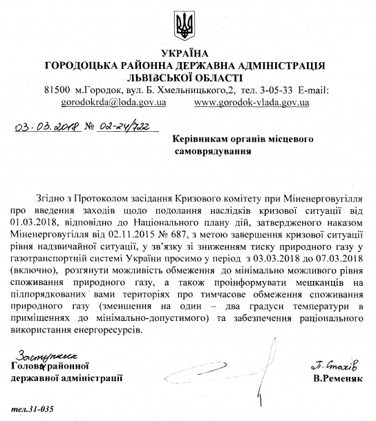 05.03.2018Відповідно до листа голови Городоцької РДА В.Ременяка, інформуємо мешканців про необхідність зменшення рівня використання газу до 7.03.2018 року. Ознайомитись із листом можна у прикріпленому файлі. Файл: 680303ср.PDF