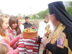 Зустрічали єпископа духовною родиною парафіян святого храму, а найменші прихожани-діточки вітали гостей зі Стрийської єпархії невимовної краси короваєм, квітами та святковими словами душевних привітань.