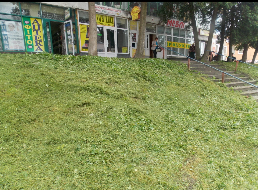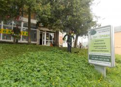 Зараз трьома косарками довершують обкошування прибудинкової території навколо будівлі колишнього комбінату побутового обслуговування населення і продовжать роботи з обкошування трави по вулиці Валовій.