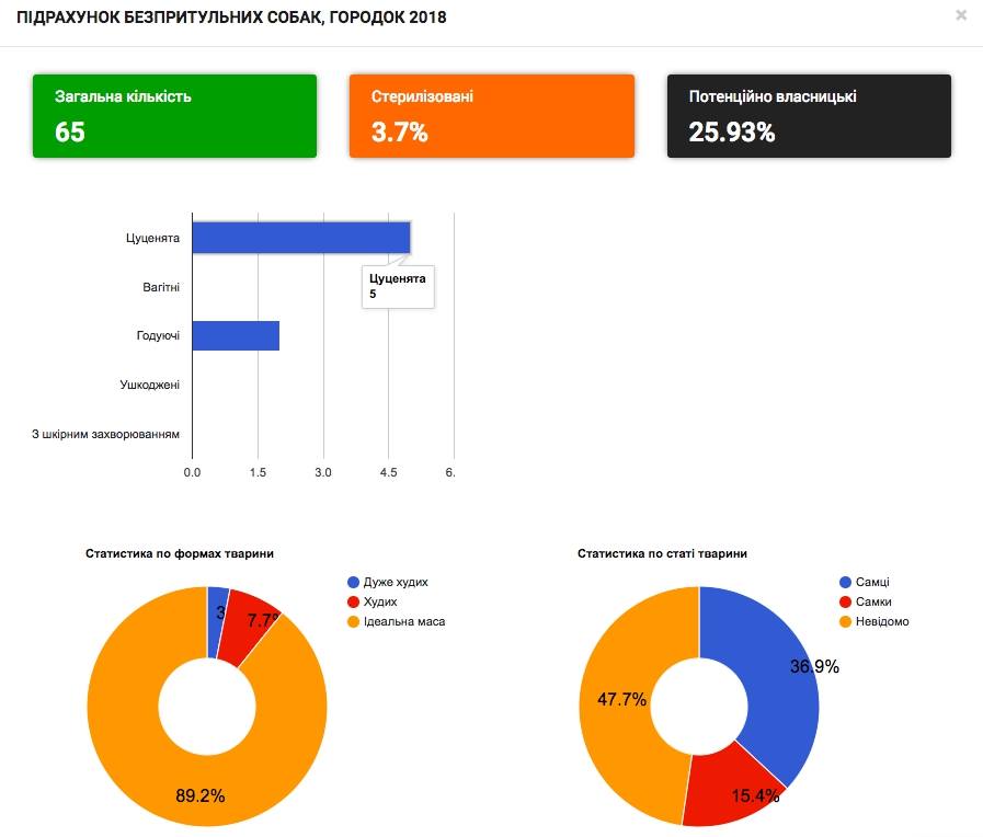 Відтак, відповідно до схем підрахунку, розроблених компанією Animal-id, у Городку нараховано приблизно 65 собак (таких, що у ранковий час блукали вулицями міста), майже 26% з яких – потенційно мають господарів. Схема – на фото.