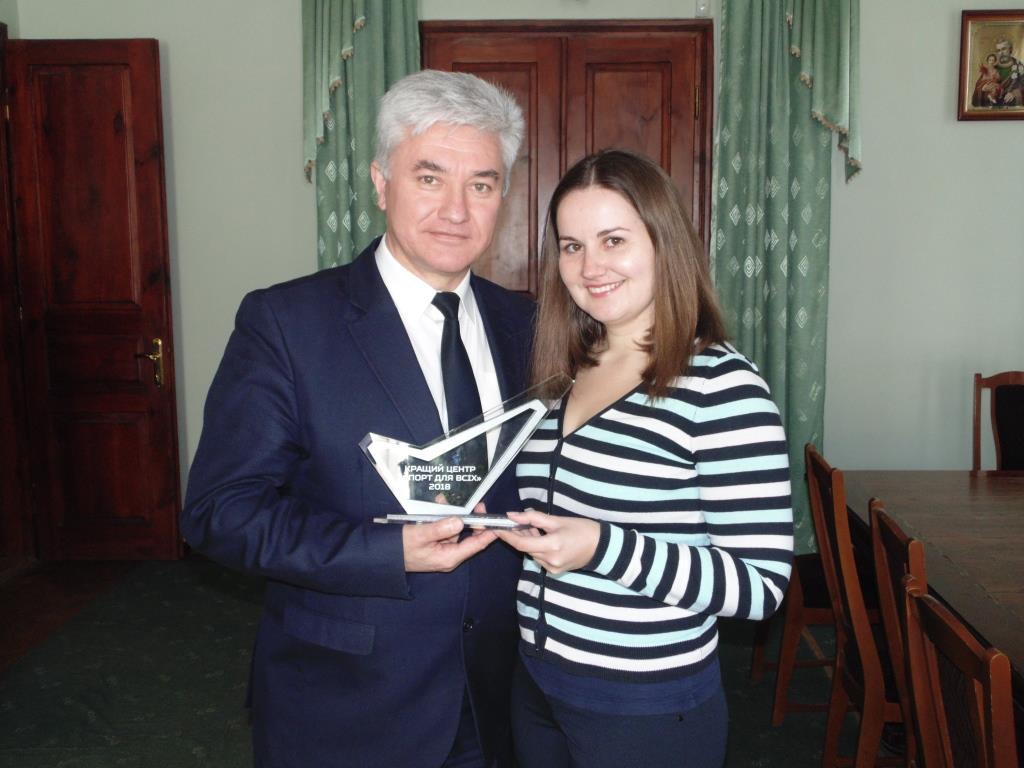 Як ми вже повідомляли раніше, городоцький «Центр «Спорт для всіх», який очолює Богдана Котяш та який є комунальною установою Городоцької міської ради, отримав високу нагороду! Установу визнану НАЙКРАЩОЮ серед таких центрів у всій Львівській області! Друге місце – у Золочівського центру, третє – в Сокальського. На фото: зі знаковою нагородою Богдану Котяш вітає міський голова Городка Роман Кущак.