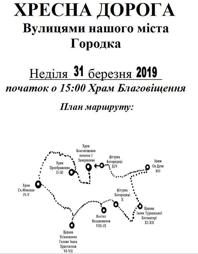 Вже традиційно, у Хрестопоклонну неділю під час Великого Посту, що в часі приготування до світлого свята Христового Воскресіння, городківчани разом із священнослужителями міських храмів вирушать у Хресну дорогу - міськими вулицями та храмами. Цьогоріч Хресну дорогу нам випадає провести наступної неділі, 31 березня.