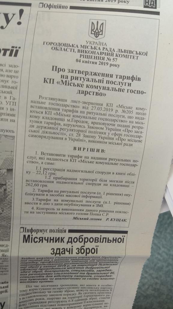 На черговому засіданні міськвиконкому, що відбулось 4 квітня, прийнято рішення №57 Про затвердження тарифів на ритуальні послуги КП «Міське комунальне господарство», а саме:реєстрація надмогильної споруди в книзі обліку – 22,12грн.; прибирання території біля могили після встановлення надмогильної споруди на кладовищі – 262,60грн.