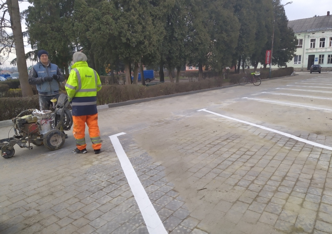 На об’єкті капітального ремонту проїзду на майдані Гайдамаків, що в центрі м.Городка (йде мова про ділянку вздовж північної частини майдану: проїзд поруч із храмом Благовіщення Пресвятої Богородиці, поліклінікою, податковою службою, судом і т.д) сьогодні організовано дорожню розмітку (розмежування паркомісць, тощо) (на фото).