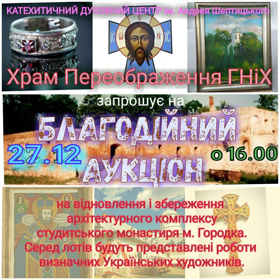 У наступну п’ятницю, 27 грудня, храм Преображення Господа нашого Ісуса Христа (монастир) та Катехитичний духовний центр ім.А.Шептицького запрошує усіх охочих взяти участь у благодійному аукціоні.