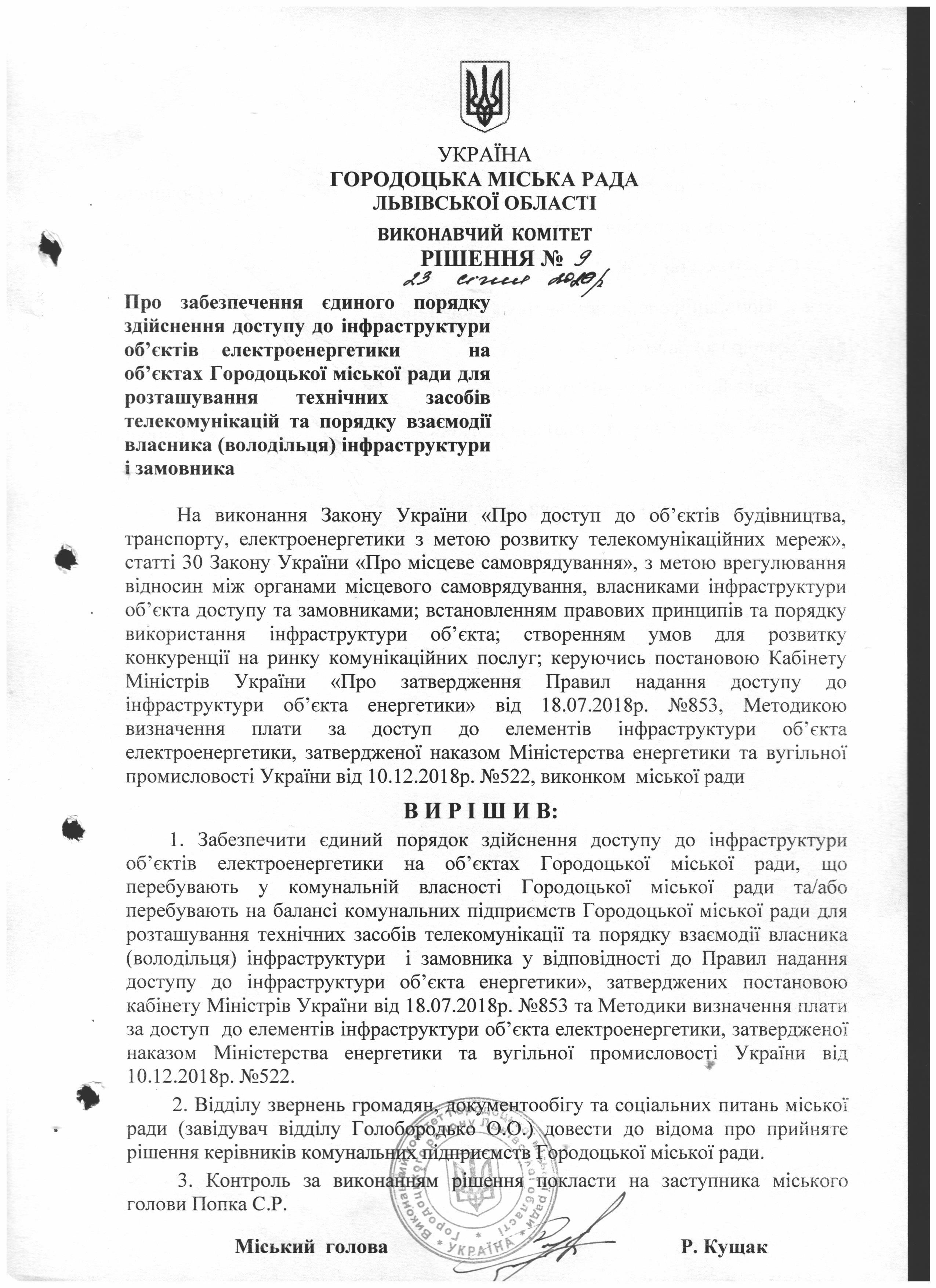 Рішення №9 "Про забезпечення єдиного порядку здійснення доступу до інфраструктури об’єктів електроенергетики на об’єктах Городоцької міської ради для розташування технічних засобів телекомунікацій та порядку взаємодії власника (володільця) інфраструктури і замовника"