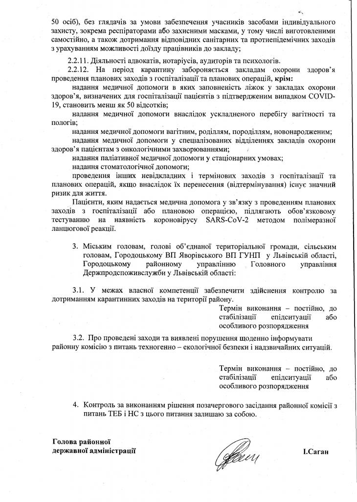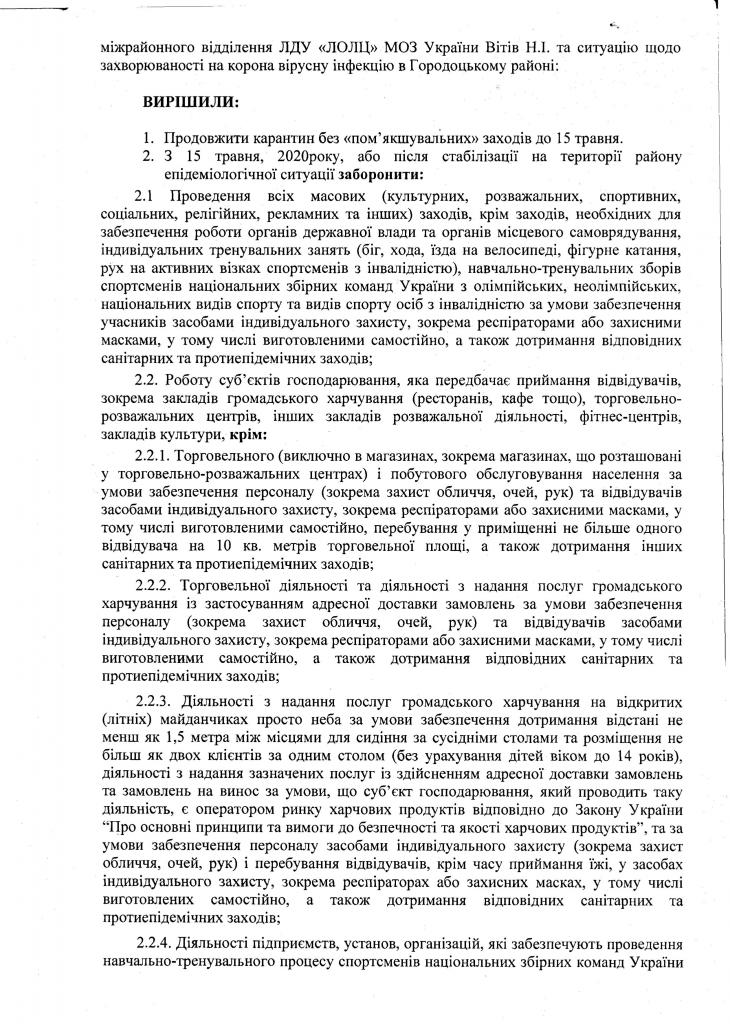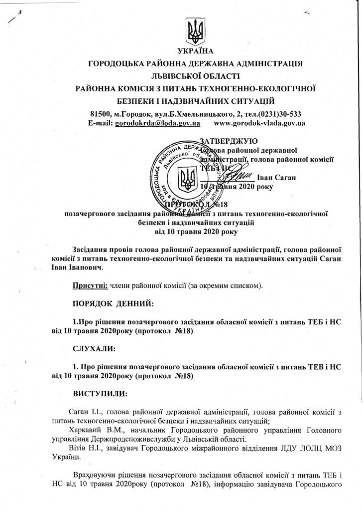 Згідно із Протоколами №17 та №18 районної комісії з питань ТЕБ і НС від 8 та 10 травня 2020 року відповідно, на території Городоцького району карантин продовжено до 22 травня 2020 року, запровадження «пом’якшувальних заходів», передбачених Постановою КМУ №342 від 4 травня 2020 року, відкладається до 15 травня.