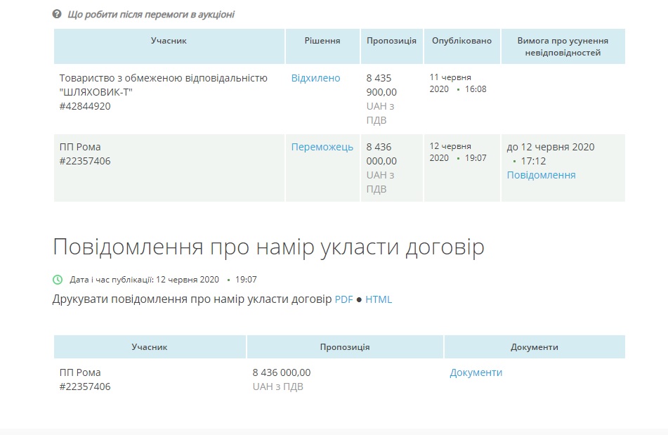 Станом на сьогоднійшній день проведено перевірку поданих учасниками документів на предмет дотримання вимогам законодавства та тендерної документації, відповідно до якої, переможцем визнано ПП "Рома". До 23 червня включно триває період оскарження, після закінчення якого із переможцем буде підписано договір і підрядник зможе приступити до виконання робіт.