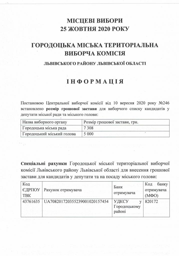 Інформує міська ТВК щодо внесення застави для участі у виборах