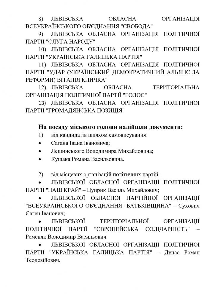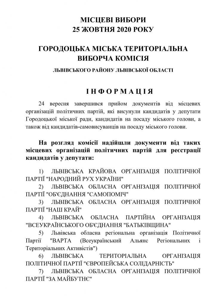 Інформує міська ТВК щодо поданих документів на реєстрацію для участі у місцевих виборах 25 жовтня 2020 року