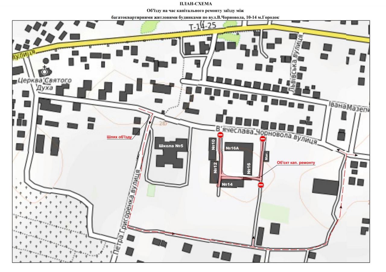 До уваги городківчан та гостей міста план-схема об'їзду на час капітального ремонту заїзду між багатоквартирними житловими будинками по вул.Чорновола, 10-14. Нагадаємо, роботи по даному об'єкту виконує ТОВ "Тройдбуд" на замовлення КП "Міське комунальне господарство" за рахунок коштів міського бюджету міста Городка.