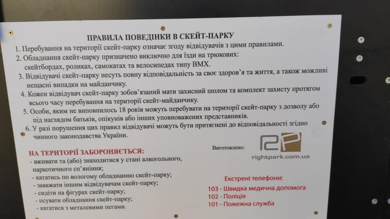 Закликаємо мешканців та гостей міста бережно ставитись до встановлених фігур, поводитись на території скейт-парку, відповідно до правил, з якими можна ознайомитись на території площадки.