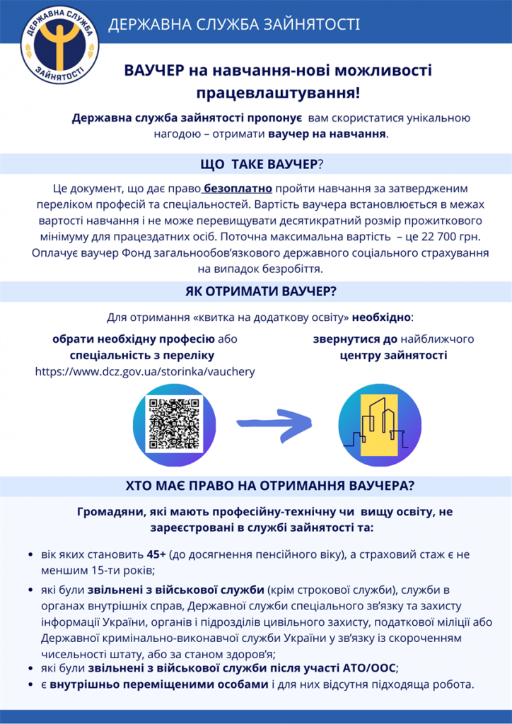 Громадяни, які мають професійну-технічну чи вищу освіту, не зареєстровані у службі зайнятості як безробітні, можуть безоплатно отримати від служби зайнятості ваучер та підвищити свій професійний рівень.