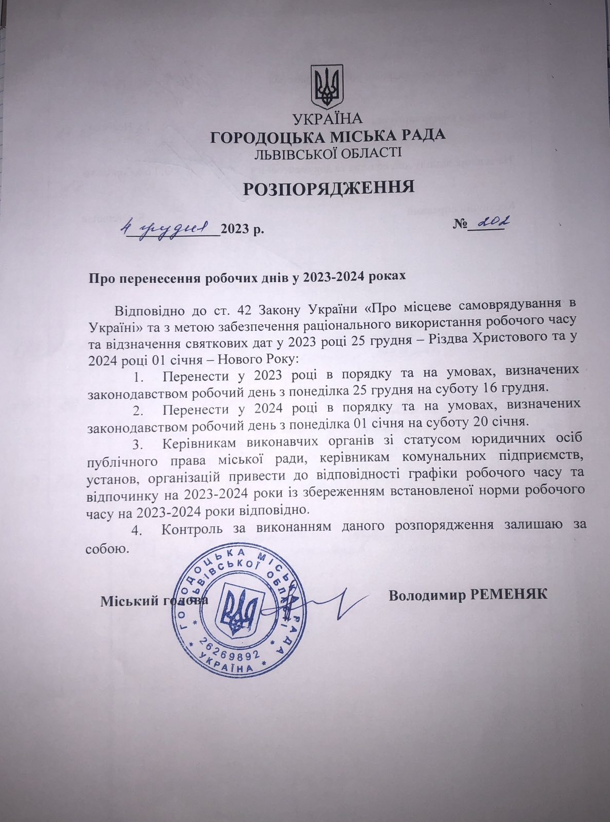 Розпорядження №201 від 04 грудня 2023 року "Про скликання чергової 41 сесії Городоцької міської ради восьмого скликання"