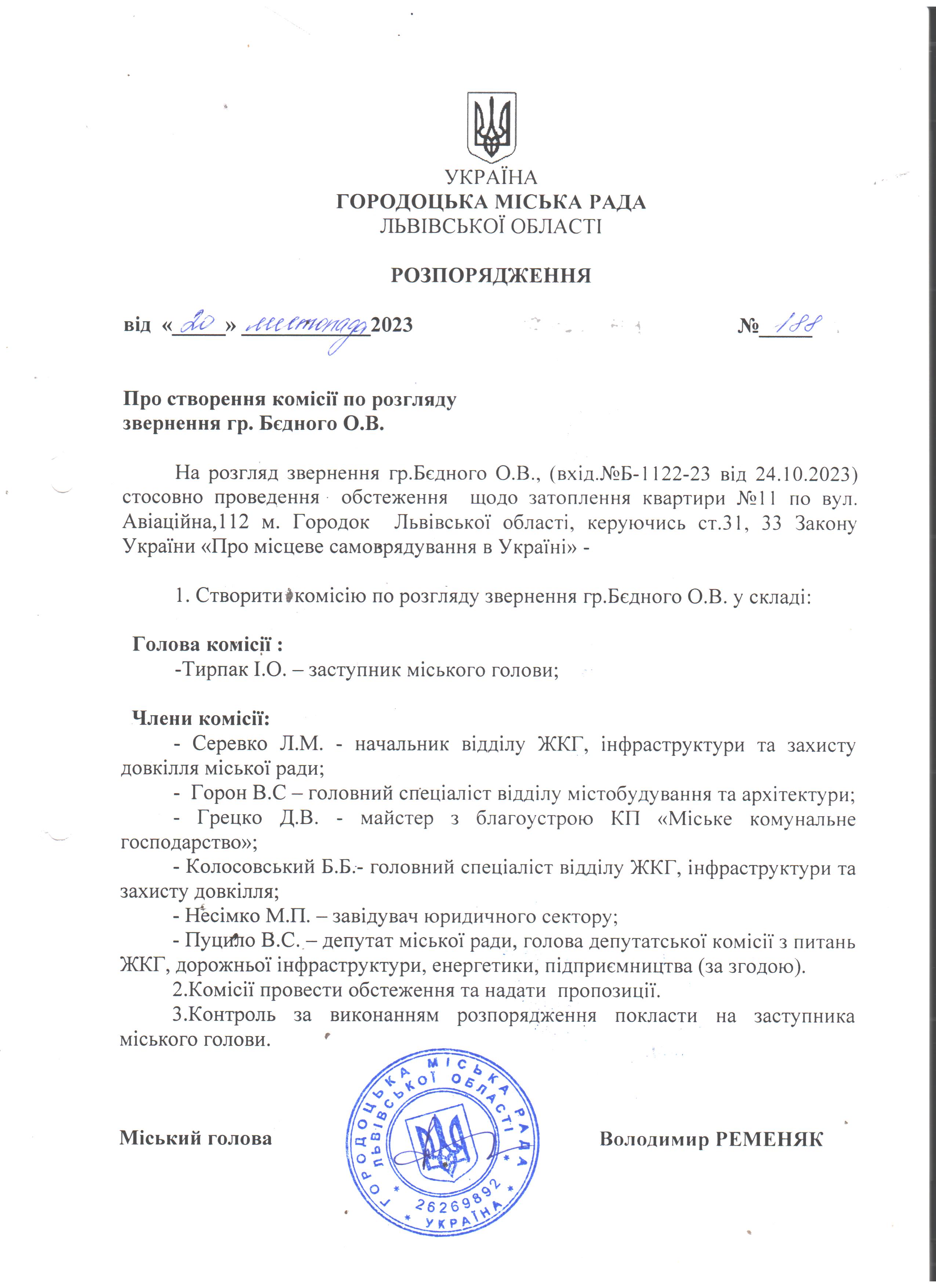 Розпорядження №188 від 20 листопада 2023 року "Про створення комісії по розгляду звернення гр.Бєдного О.В."