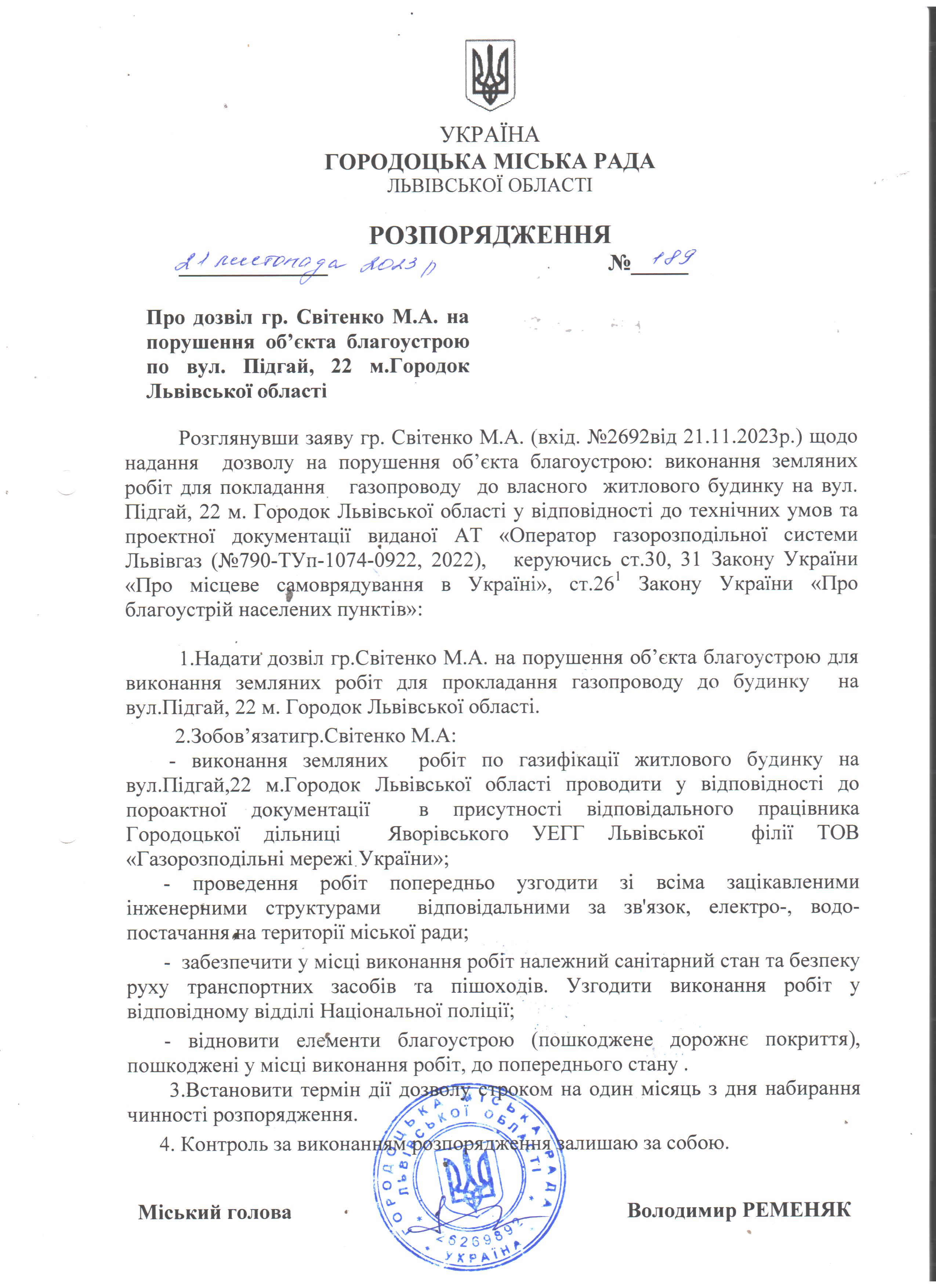 Розпорядження №189 від 21 листопада 2023 року "Про дозвіл гр.Світенко М.А. на порушення об'єкта благоустрою по вул.Підгай, 22 м.Городок Львівської області"