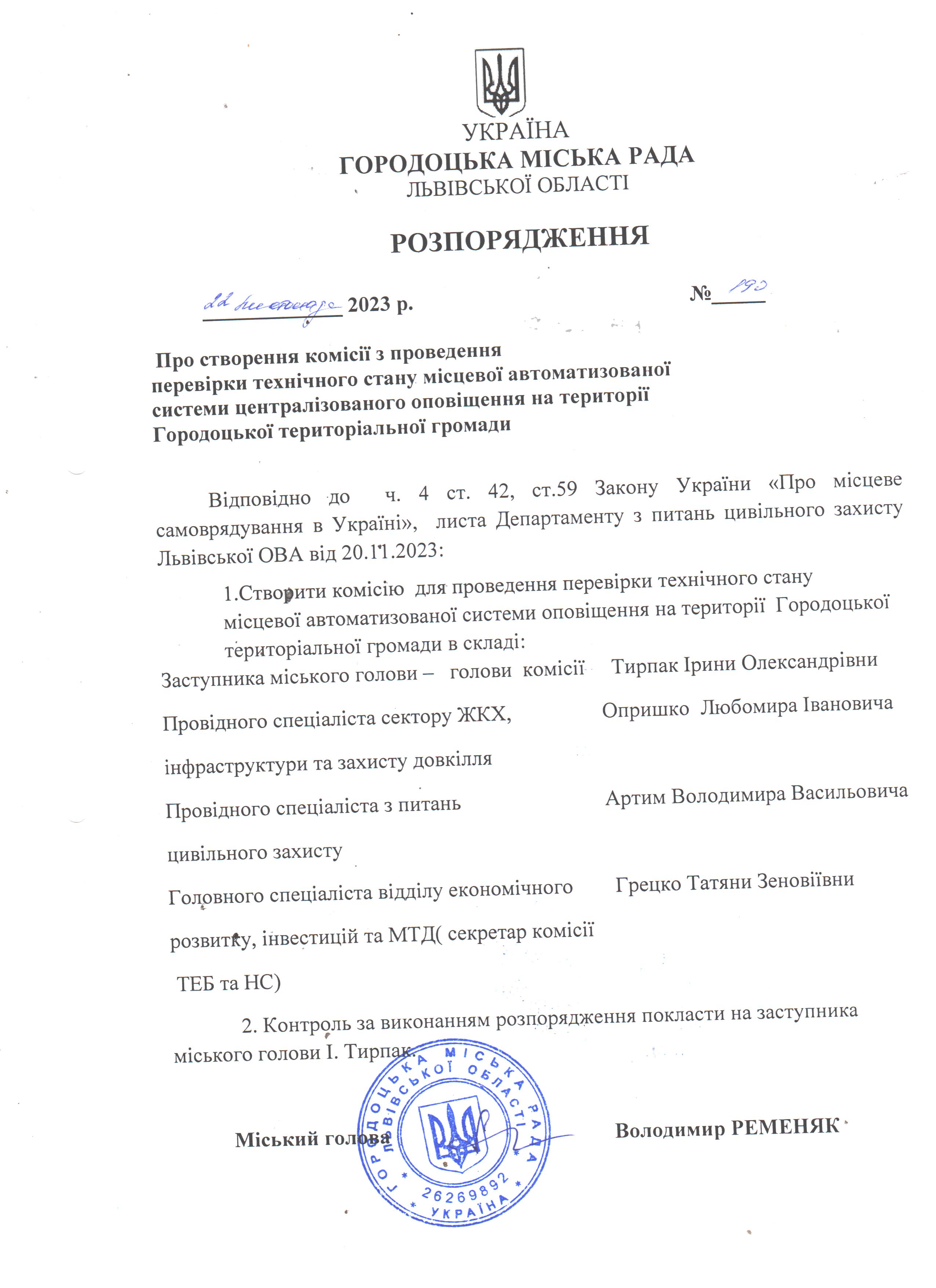 Розпорядження №190 від 22 листопада 2023 року "Про створення комісії з проведення перевірки технічного стану місцевої автоматизованої системи централізованого оповіщення на території Городоцької територіальної громади"