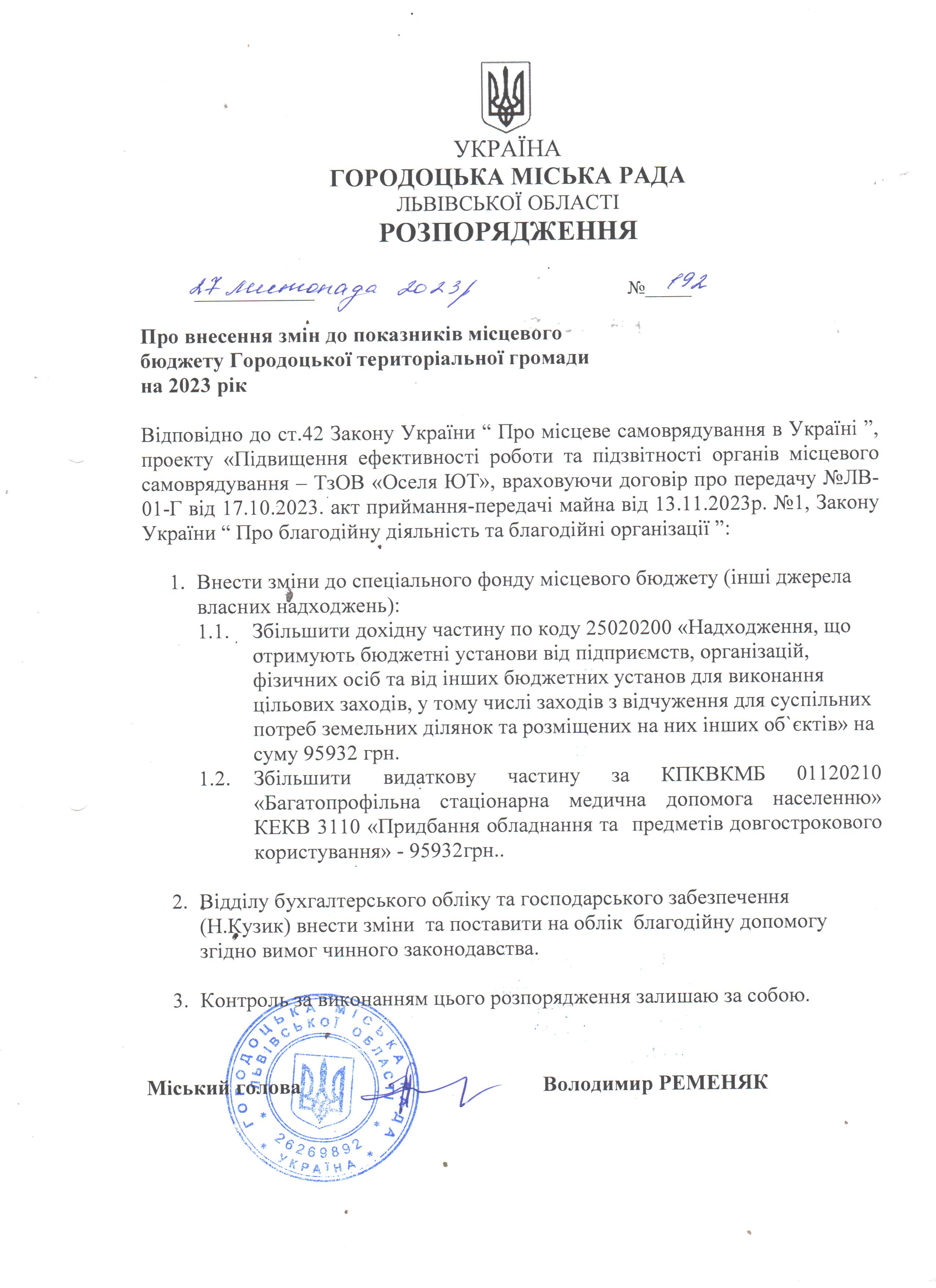 Розпорядження №192 від 27 листопада 2023 року "Про внесення змін до показників місцевого бюджету Городоцької територіальної громади на 2023 рік"