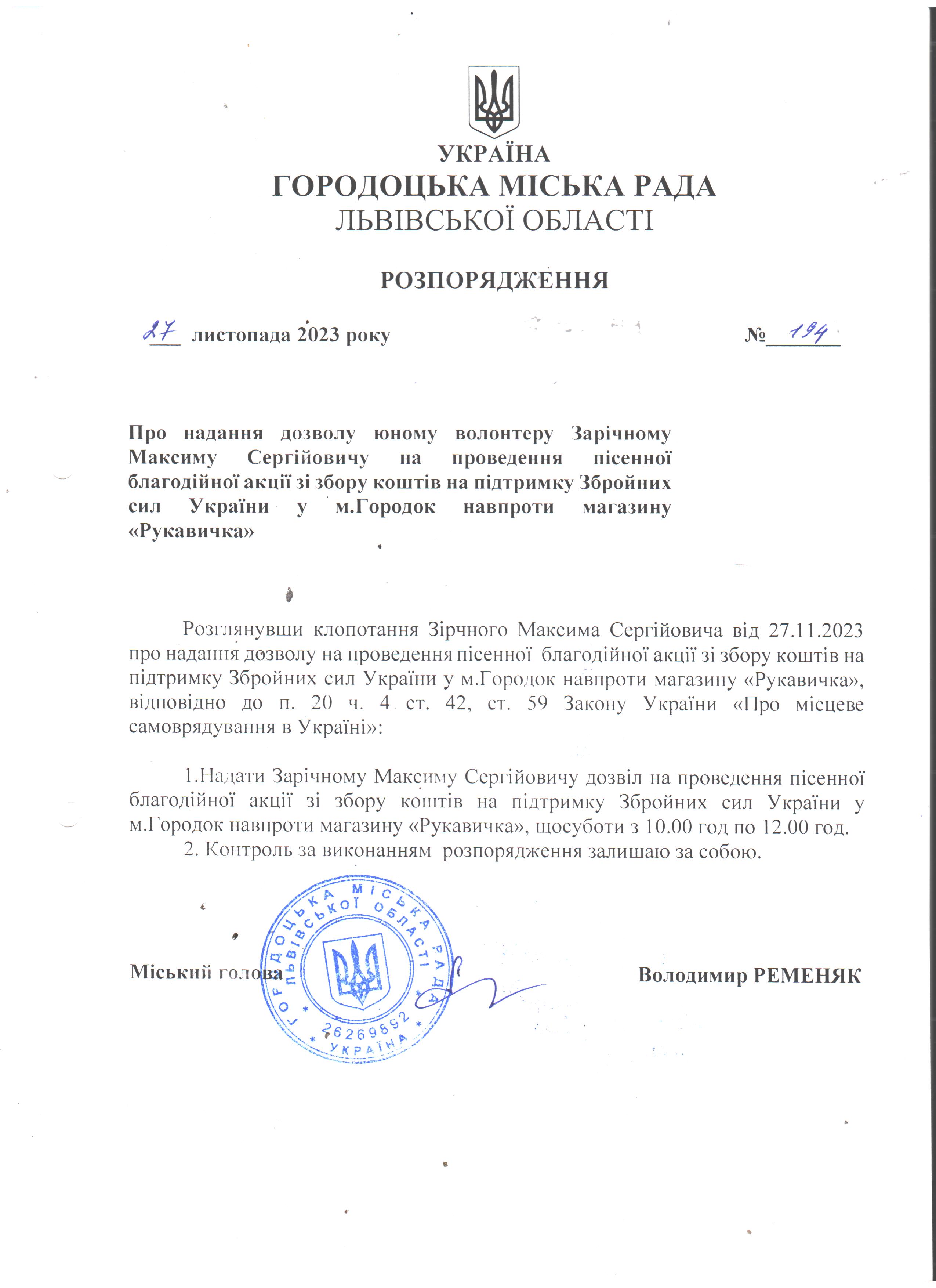 Розпорядження №194 від 27 листопада 2023 року "Про надання дозволу юному волонтеру Зарічному Максиму Сергійовичу на проведення пісенної благодійної акції зі збору коштів на підтримку Збройних сил України у м.Городок навпроти магазину "Рукавичка""