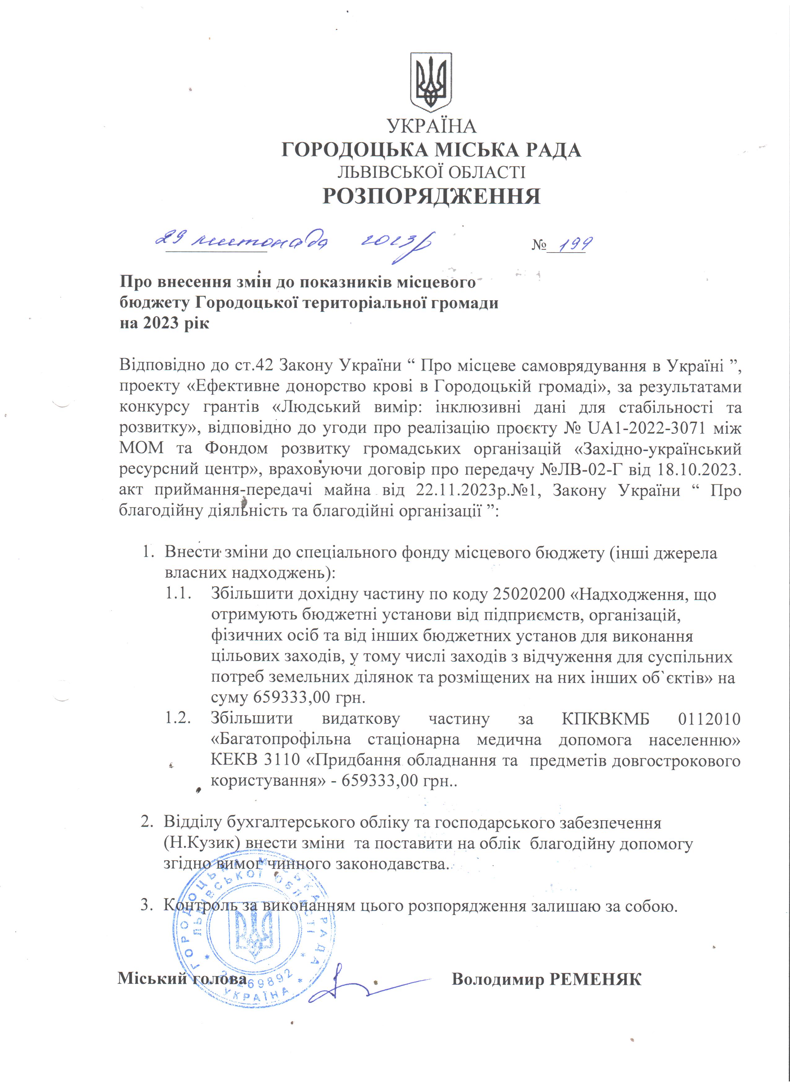 Розпорядження №199 від 29 листопада 2023 року "Про внесення змін до показників місцевого бюджету Городоцької територіальної громади на 2023 рік"
