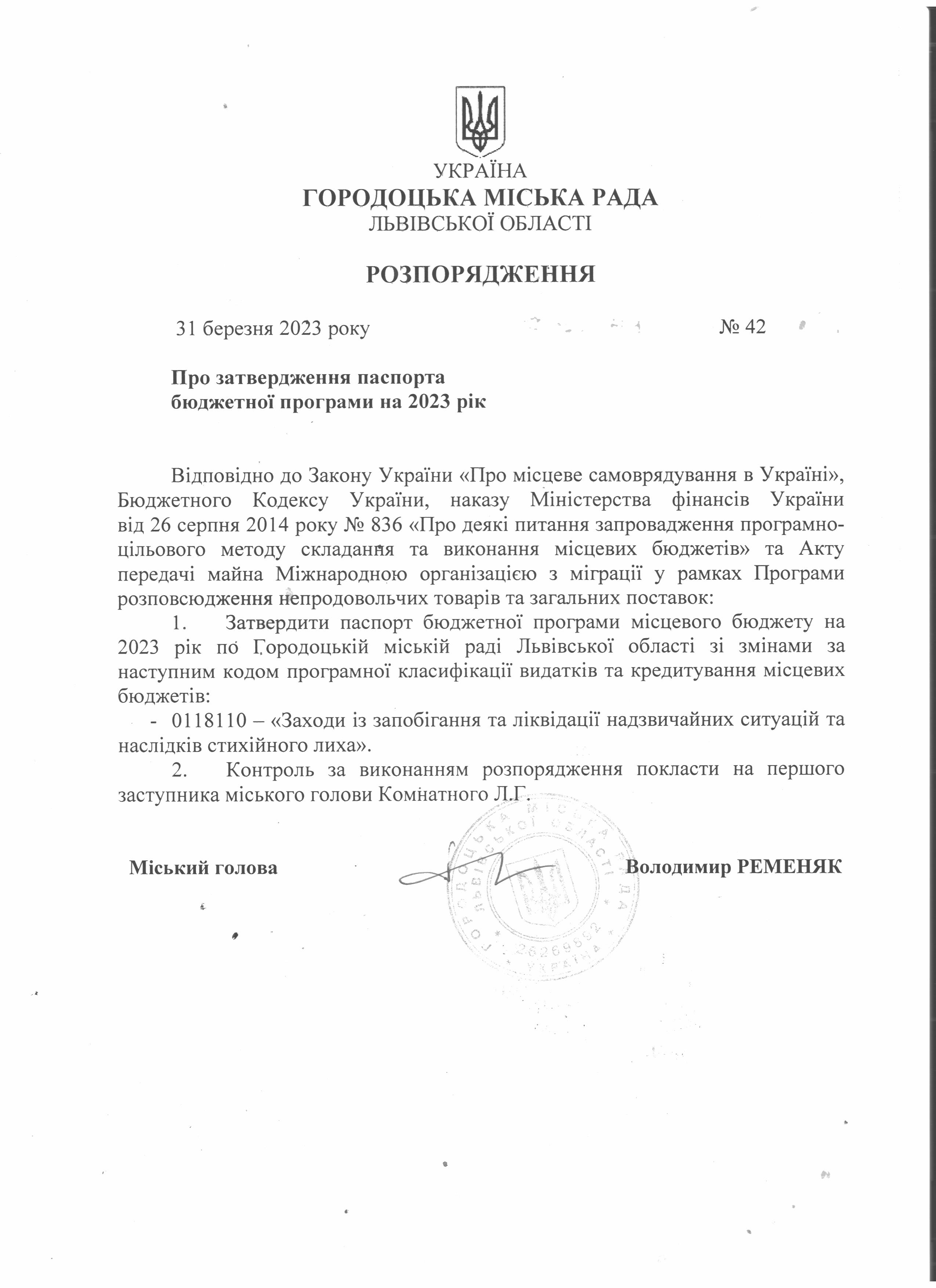 Розпорядження міського голови №42 від 31 березня 2023 року "Про затвердження паспорта бюджетної програми на 2023 рік" Файл: 42.jpeg Паспорт по КПКВ 0118110.pdf