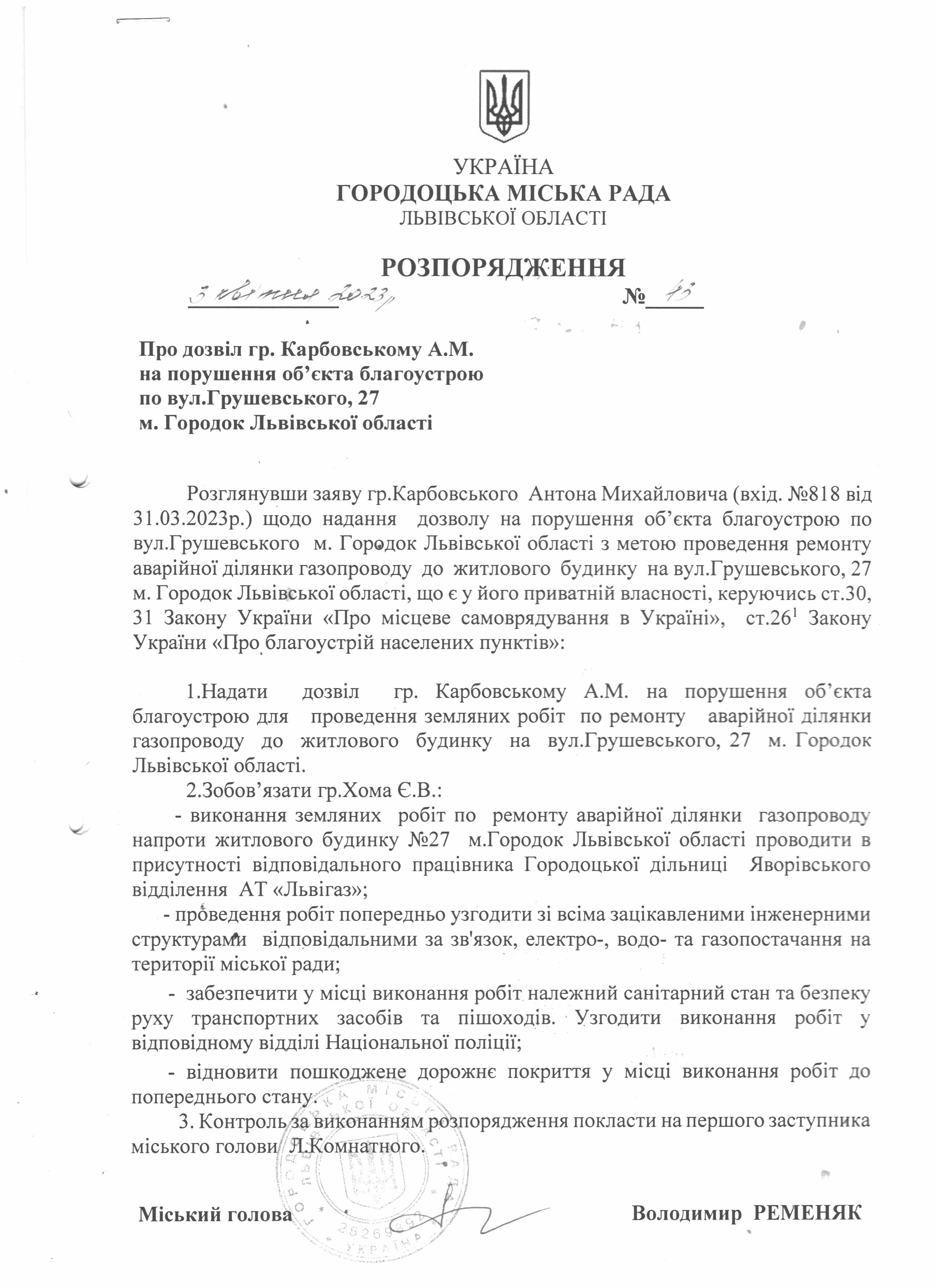 Розпорядження міського голови №43 від 03 квітня 2023 року "Про дозвіл гр.Карбовському А.М. на порушення об'єкта благоустрою по вул.Грушевського, 27 м.Городок Львівської області" Файл: 43.jpeg