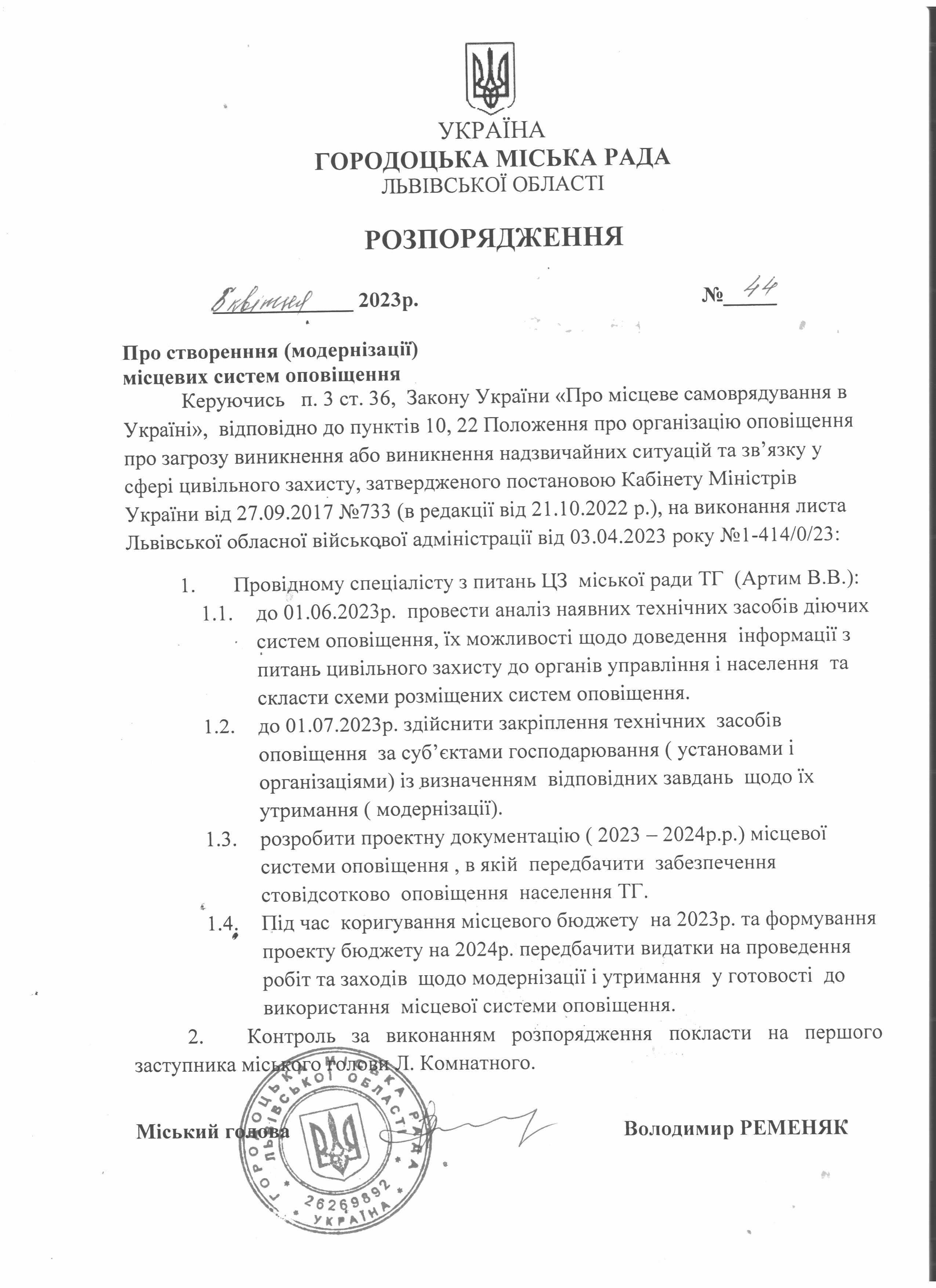 Розпорядження міського голови №44 від 06 квітня 2023 року "Про створення (модернізації) місцевих систем оповіщення" Файл: 44.jpeg