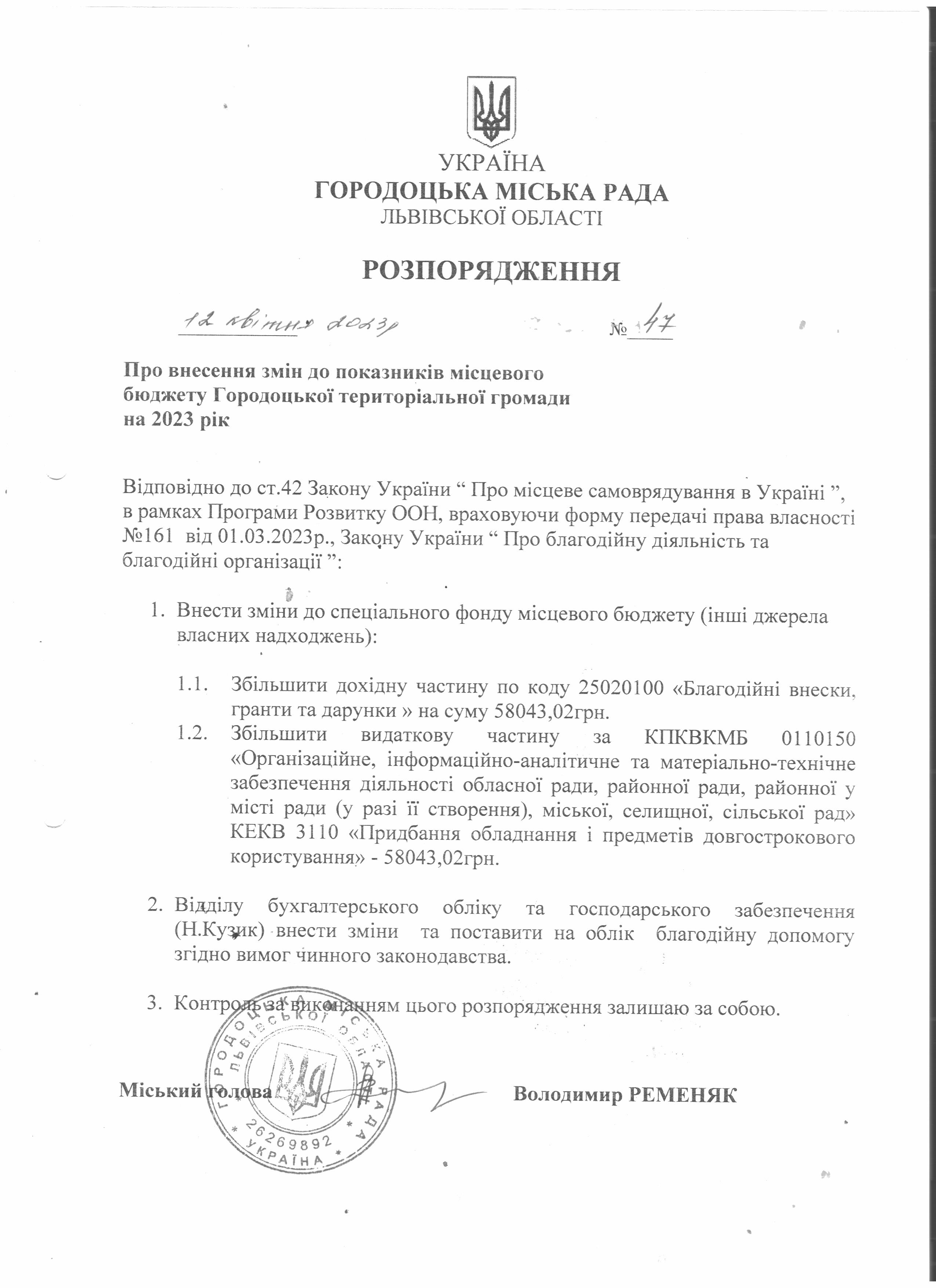 Розпорядження міського голови №47 від 12 квітня 2023 року "Про внесення змін до показників місцевого бюджету Городоцької територіальної громади на 2023 рік" Файл: 47.jpeg
