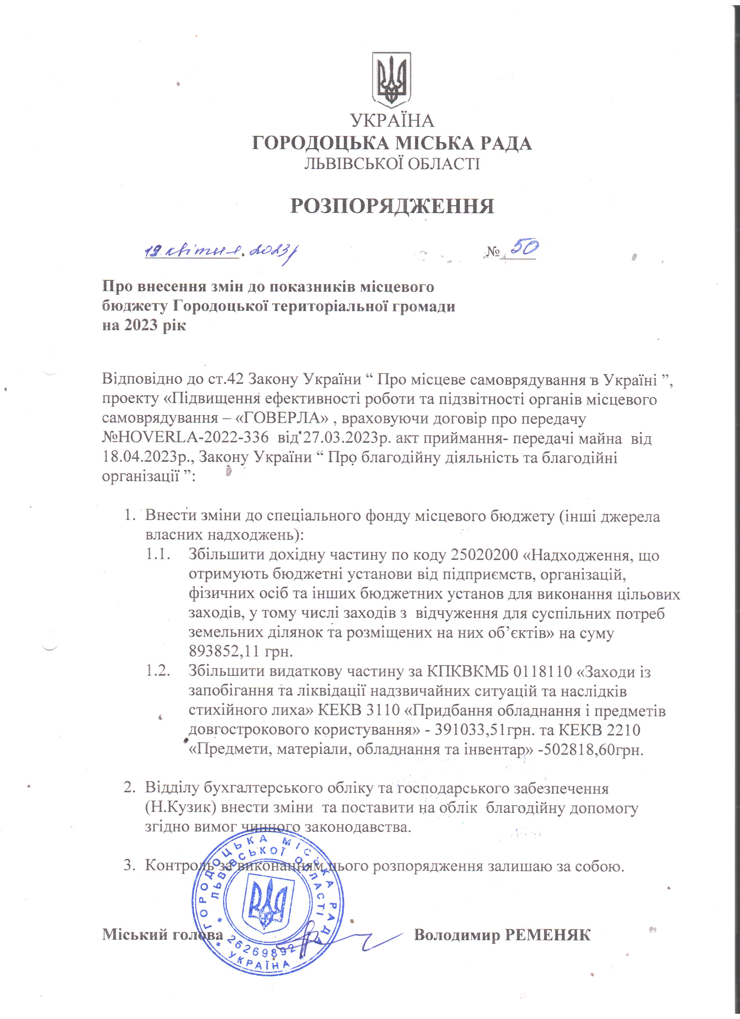 Розпорядження міського голови №50 від 19 квітня 2023 року "Про внесення змін до показників місцевого бюджету Городоцької територіальної громади на 2023 рік" Файл: 50.jpeg