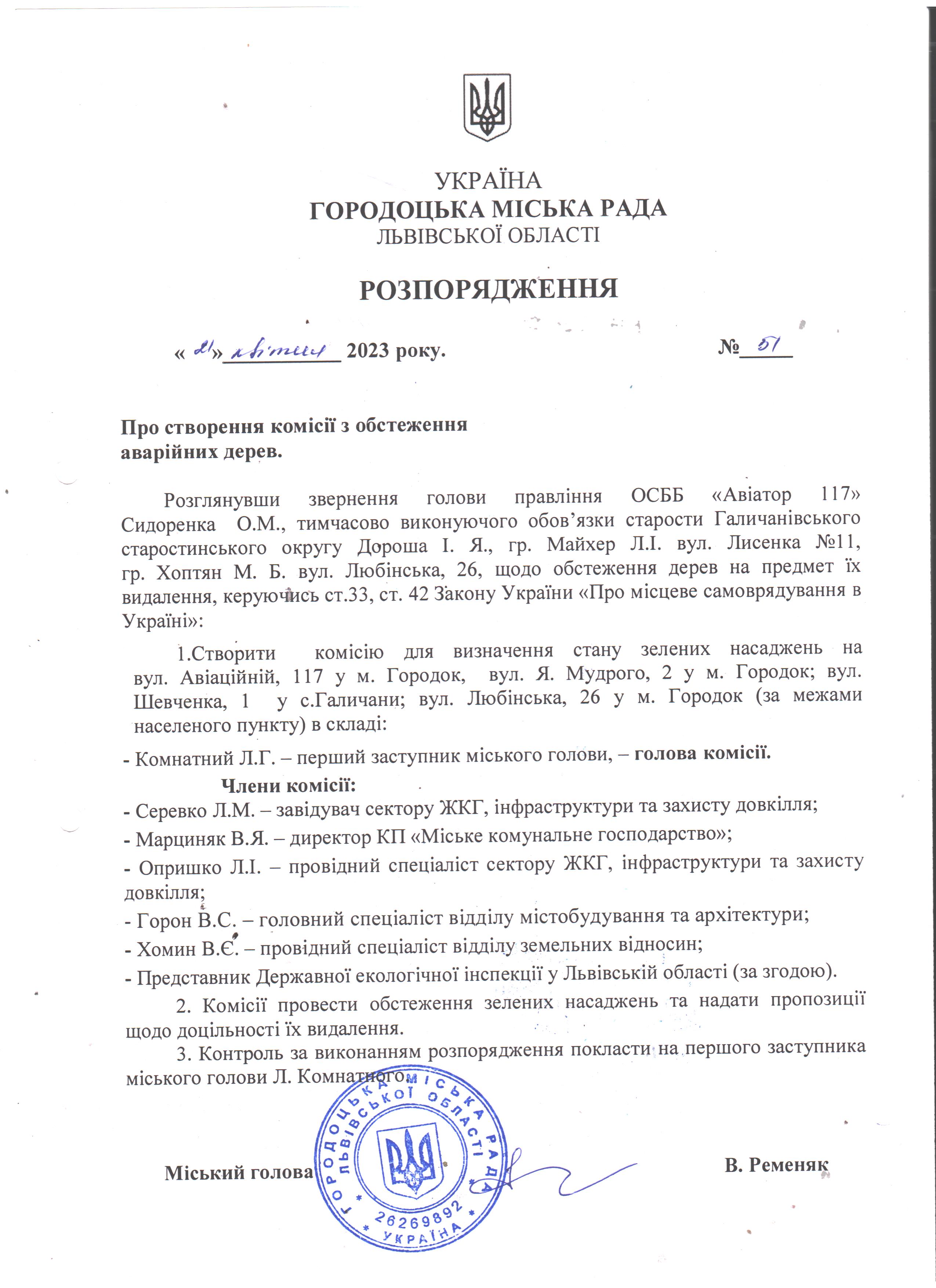 Розпорядження міського голови №51 від 21 квітня 2023 року "Про створення комісії з обстеження аварійних дерев" Файл: 51.jpeg
