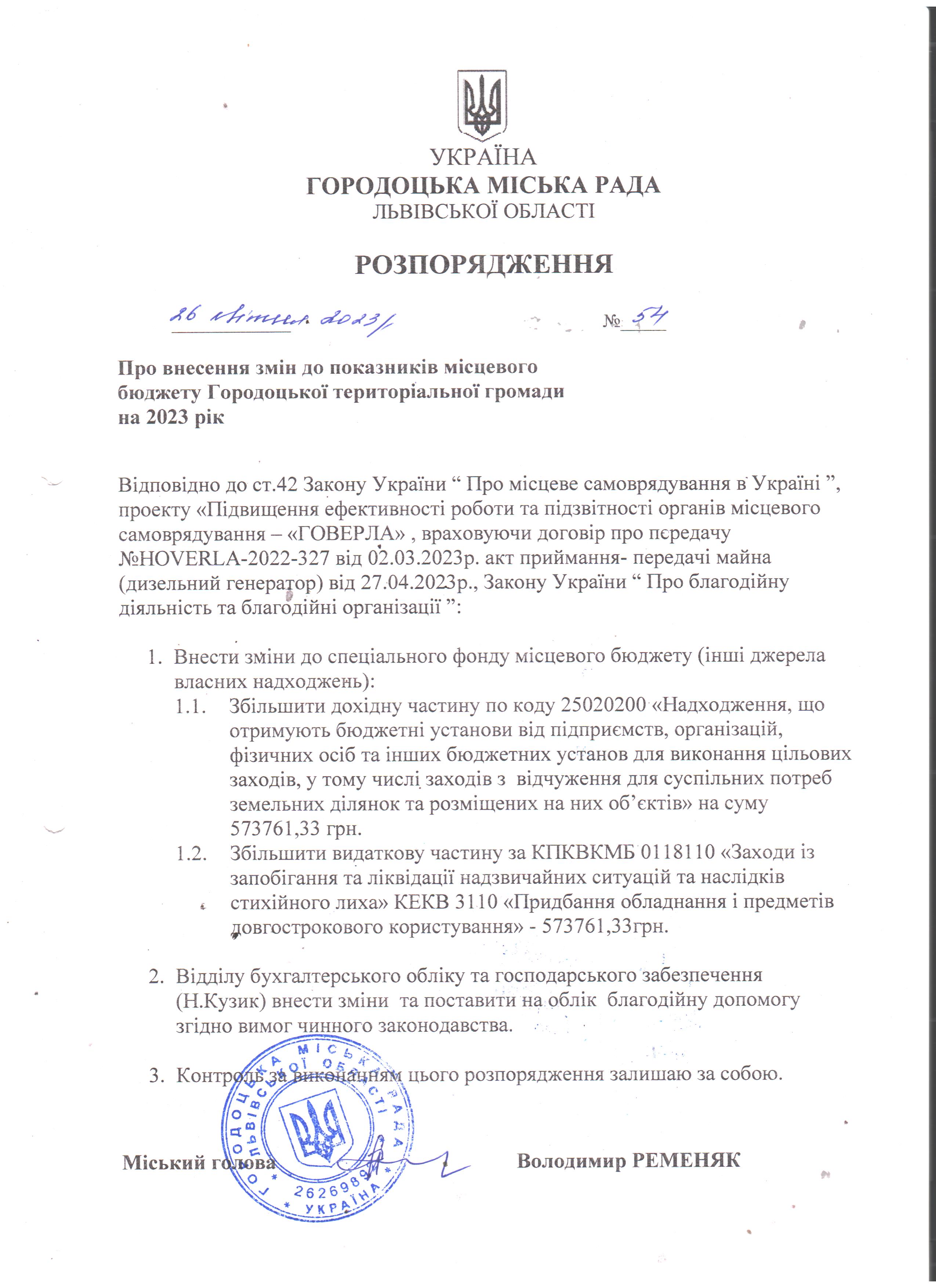 Розпорядження міського голови №54 від 26 квітня 2023 року "Про внесення змін до показників місцевого бюджету Городоцької територіальної громади на 2023 рік" Файл: 54.jpeg