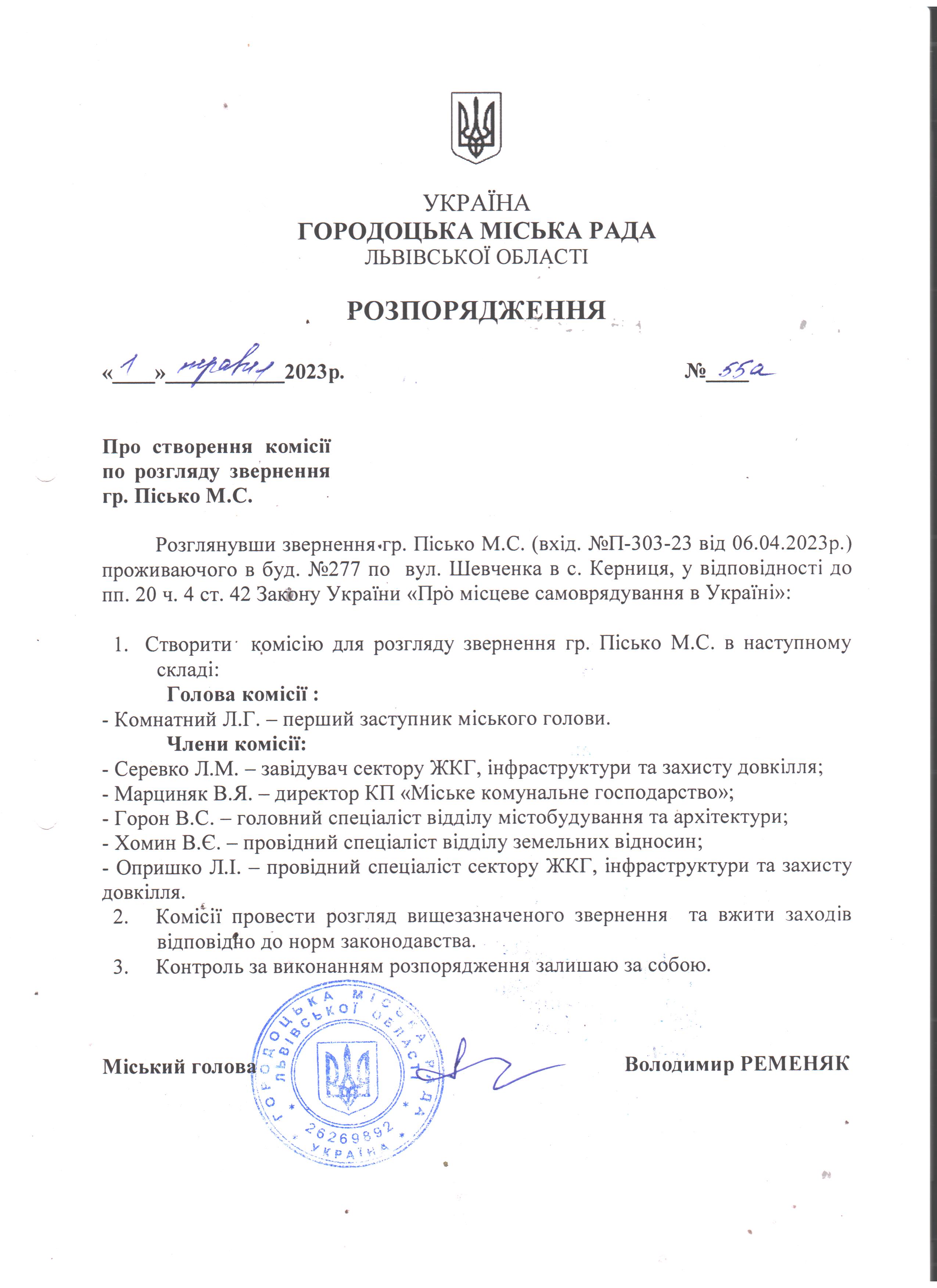 Розпорядження міського голови №55-А від 01 травня 2023 року "Про створення комісії по розгляду звернення гр.Пісько М.С." Файл: 55-А.jpeg