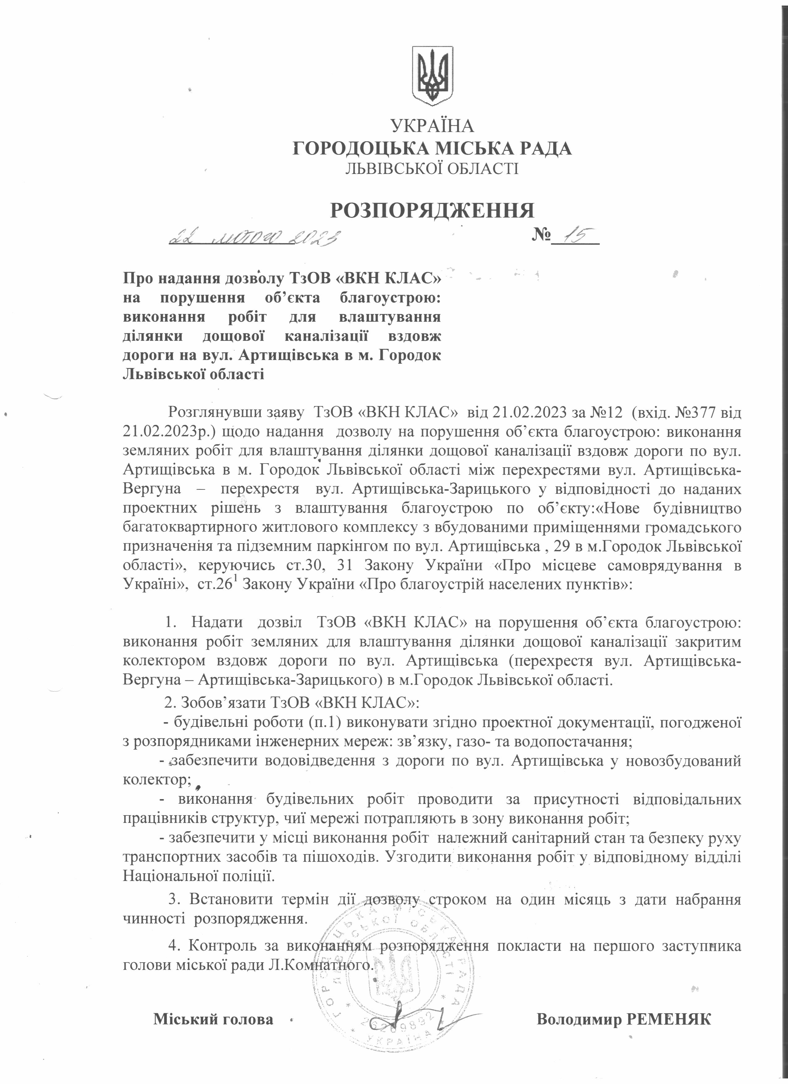 Розпорядження №15 від 22 лютого 2023 "Про надання дозволу ТзОВ "ВКН КЛАС" на порушення об'єкта благоустрою: виконання робіт для влаштування ділянки дощової каналізації вздовж дороги на вул.Артищівська в м.Городок Львівської області" Файл: 15.jpeg