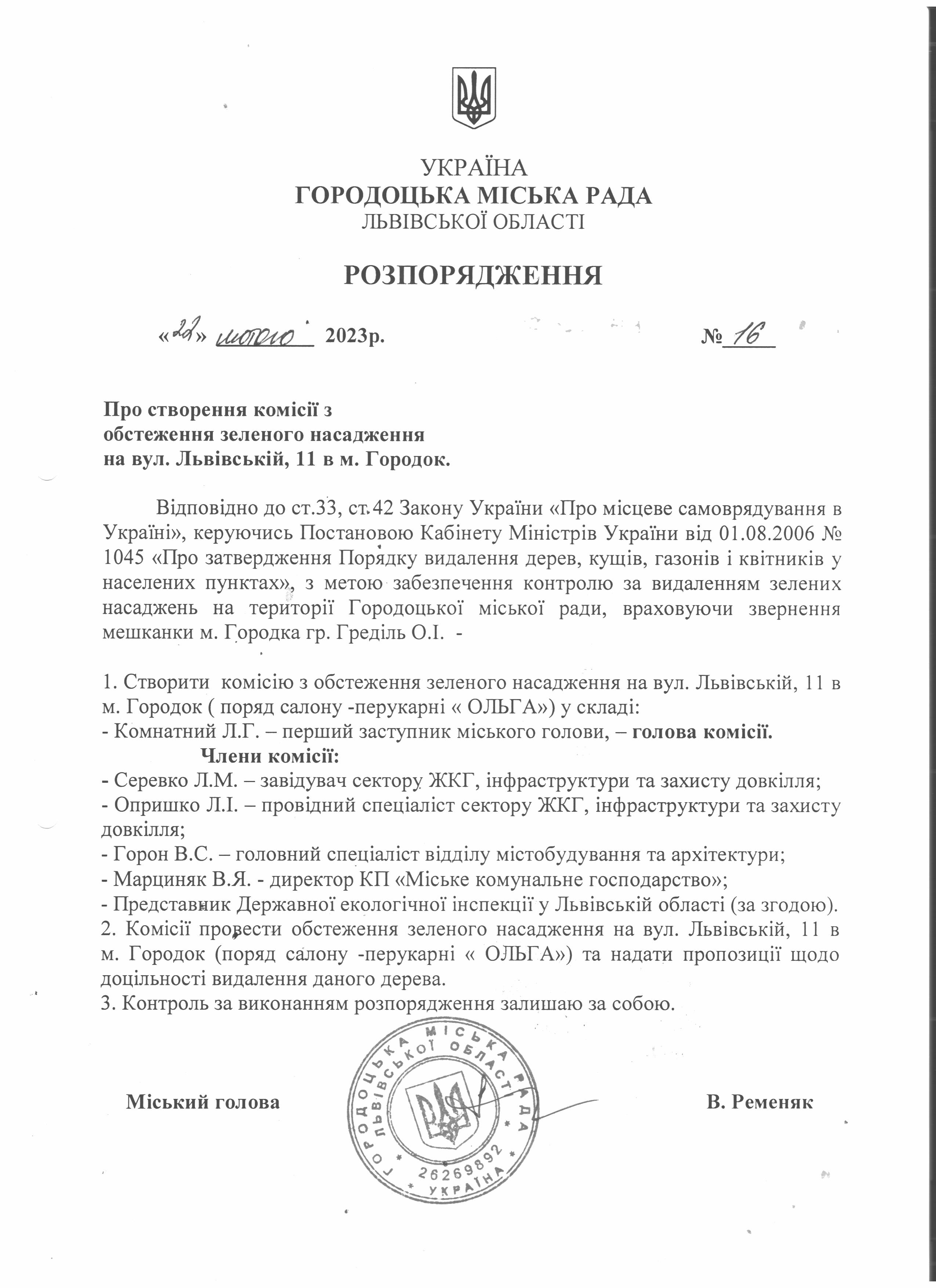 Розпорядження №16 від 22 лютого 2023 "Про створення комісії з обстеження зеленого насадження на вул.Львівській, 11 в м.Городок" Файл: 16.jpeg