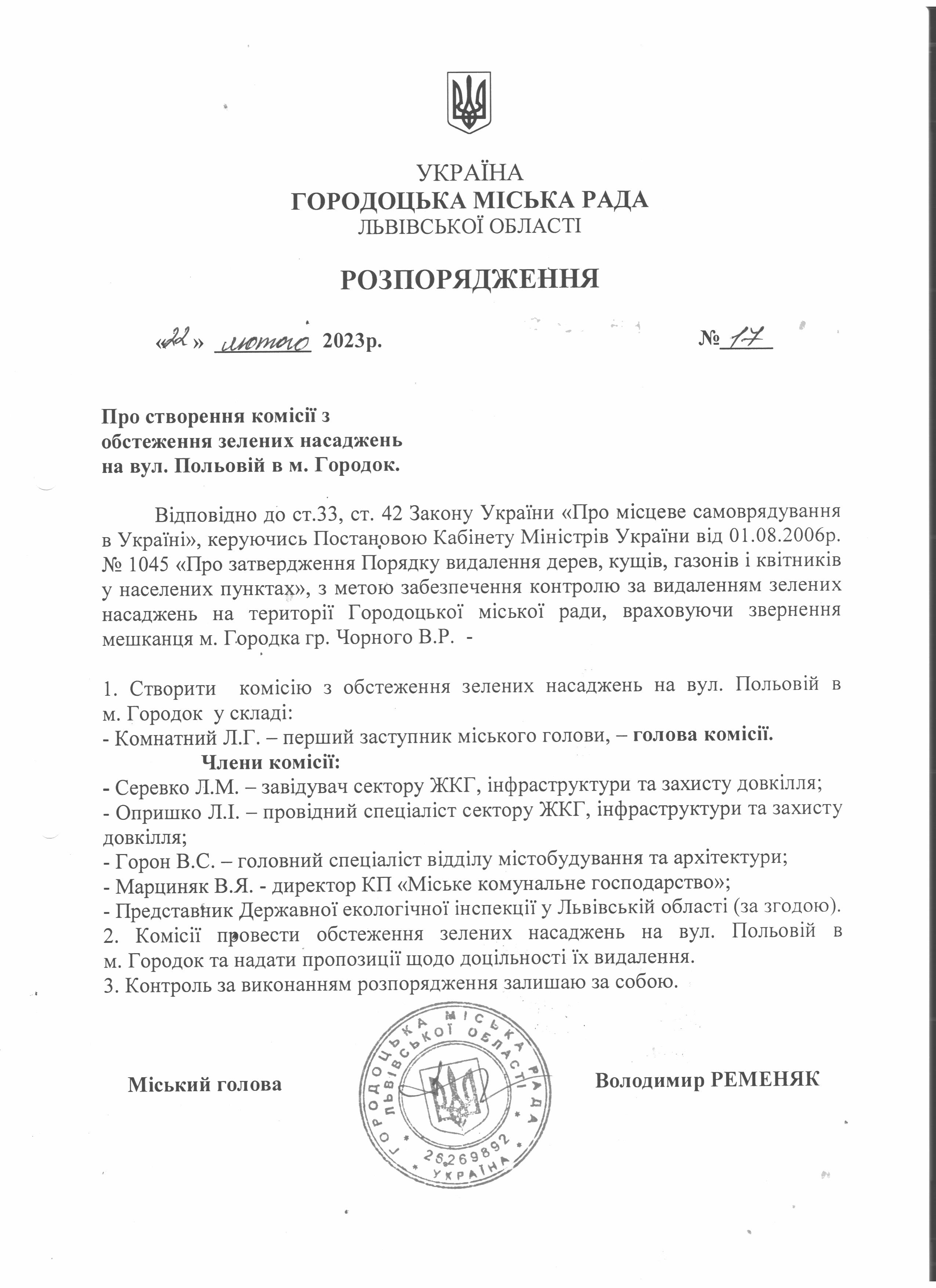 Розпорядження №17 від 22 лютого 2023 "Про створення комісії з обстеження зелених насаджень на вул.Польовій в м.Городок" Файл: 17.jpeg