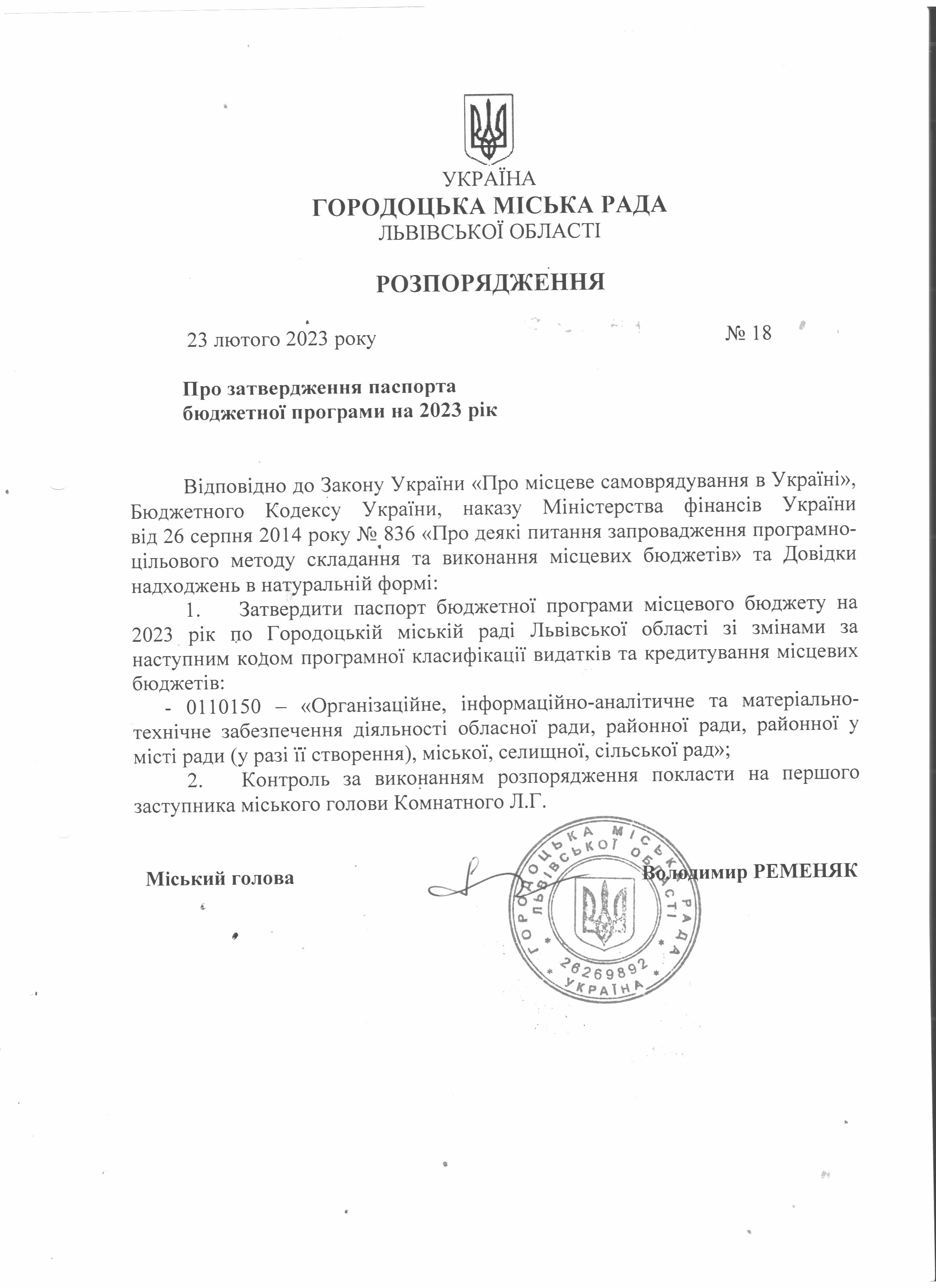Розпорядження №18 від 23 лютого 2023 "Про затвердження паспорта бюджетної програми на 2023 рік" Файл: 18.jpeg