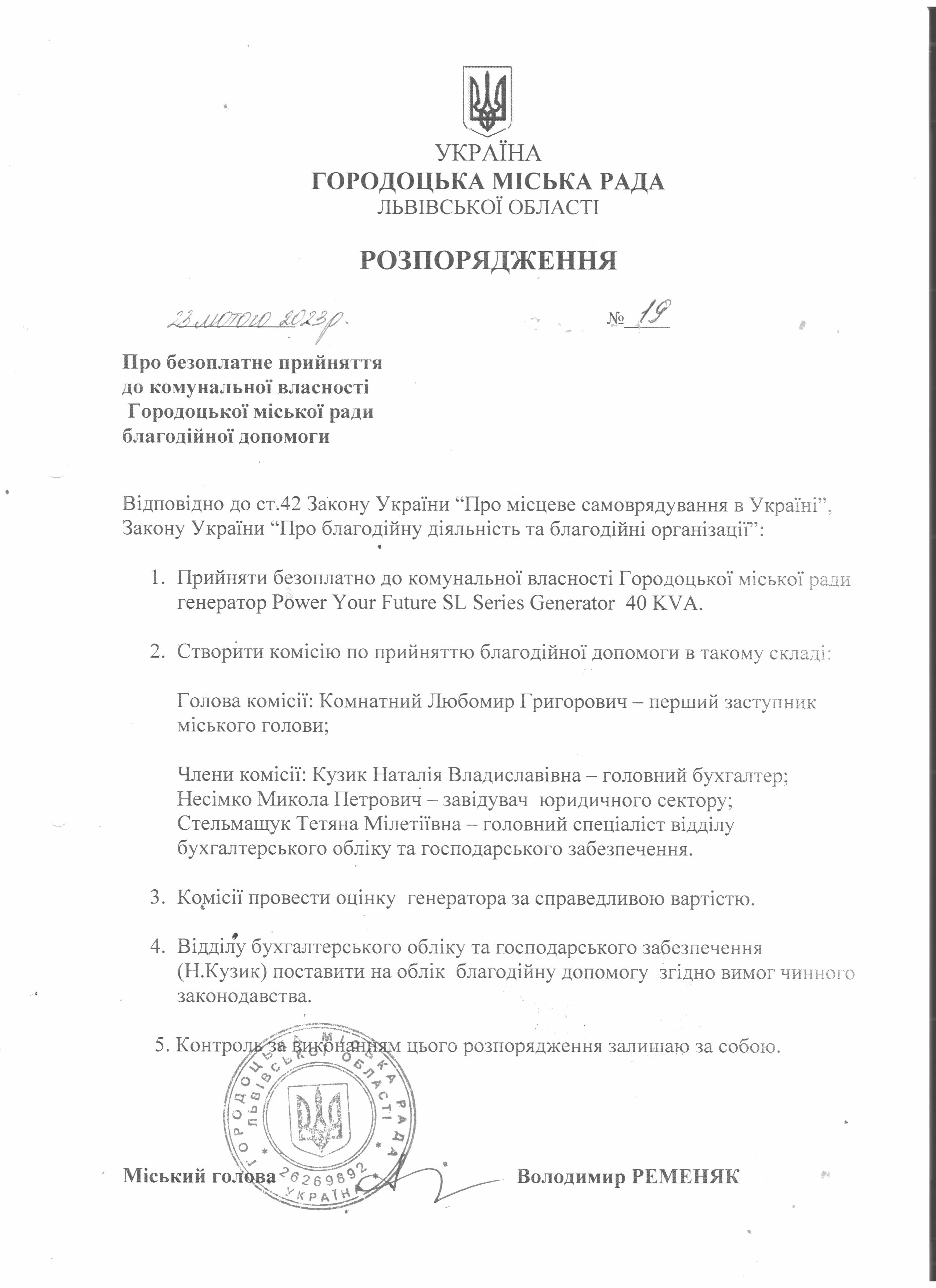 Розпорядження №19 від 23 лютого 2023 "Про безоплатне прийняття до комунальної власності Городоцької міської ради благодійної допомоги" Файл: 19.jpeg