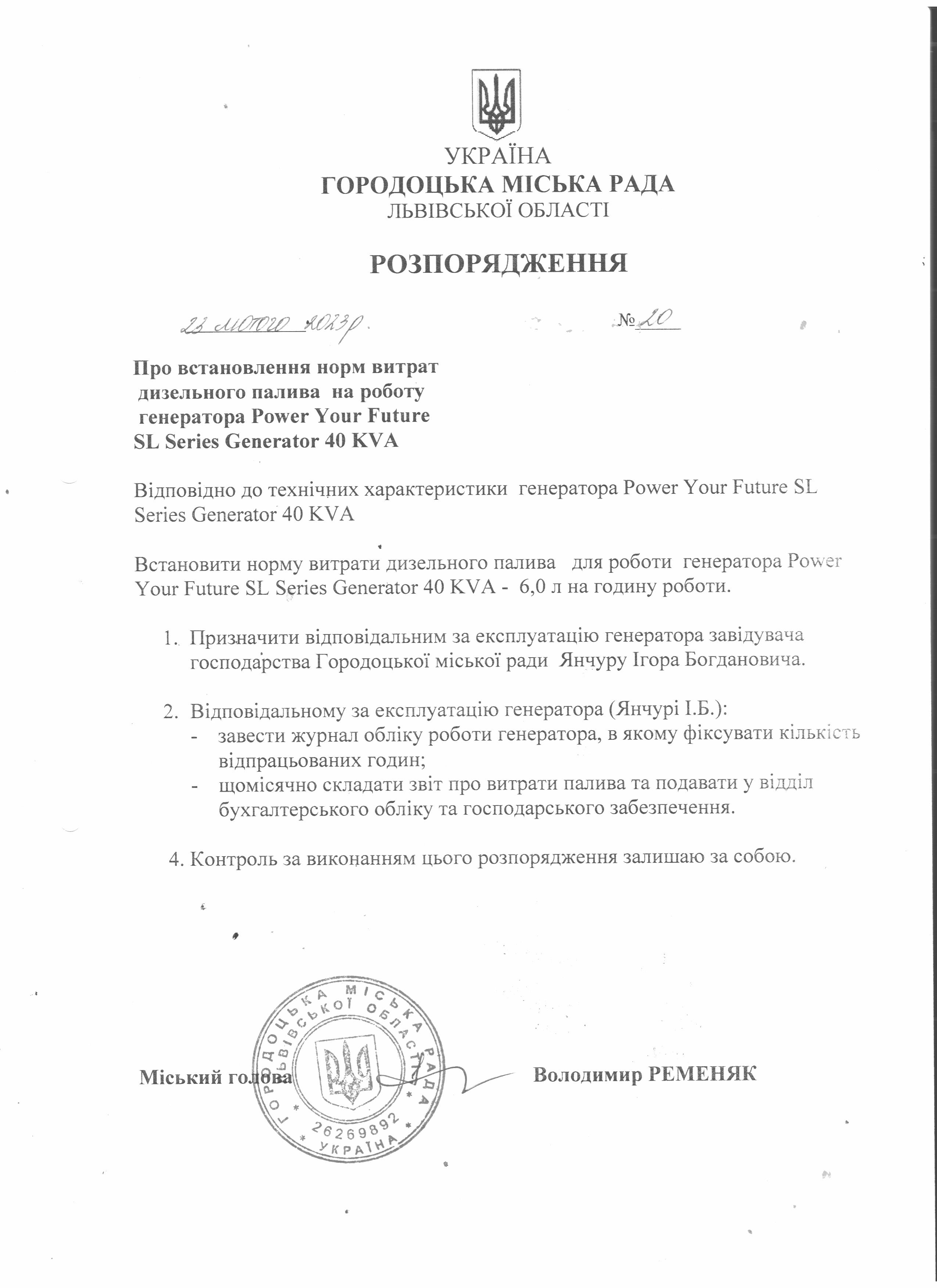 Розпорядження №20 від 23 лютого 2023 "Про встановлення норм витрат дизельного палива на роботу генератора Power Your Future SL Series Generator 40 KVA" Файл: 20.jpeg