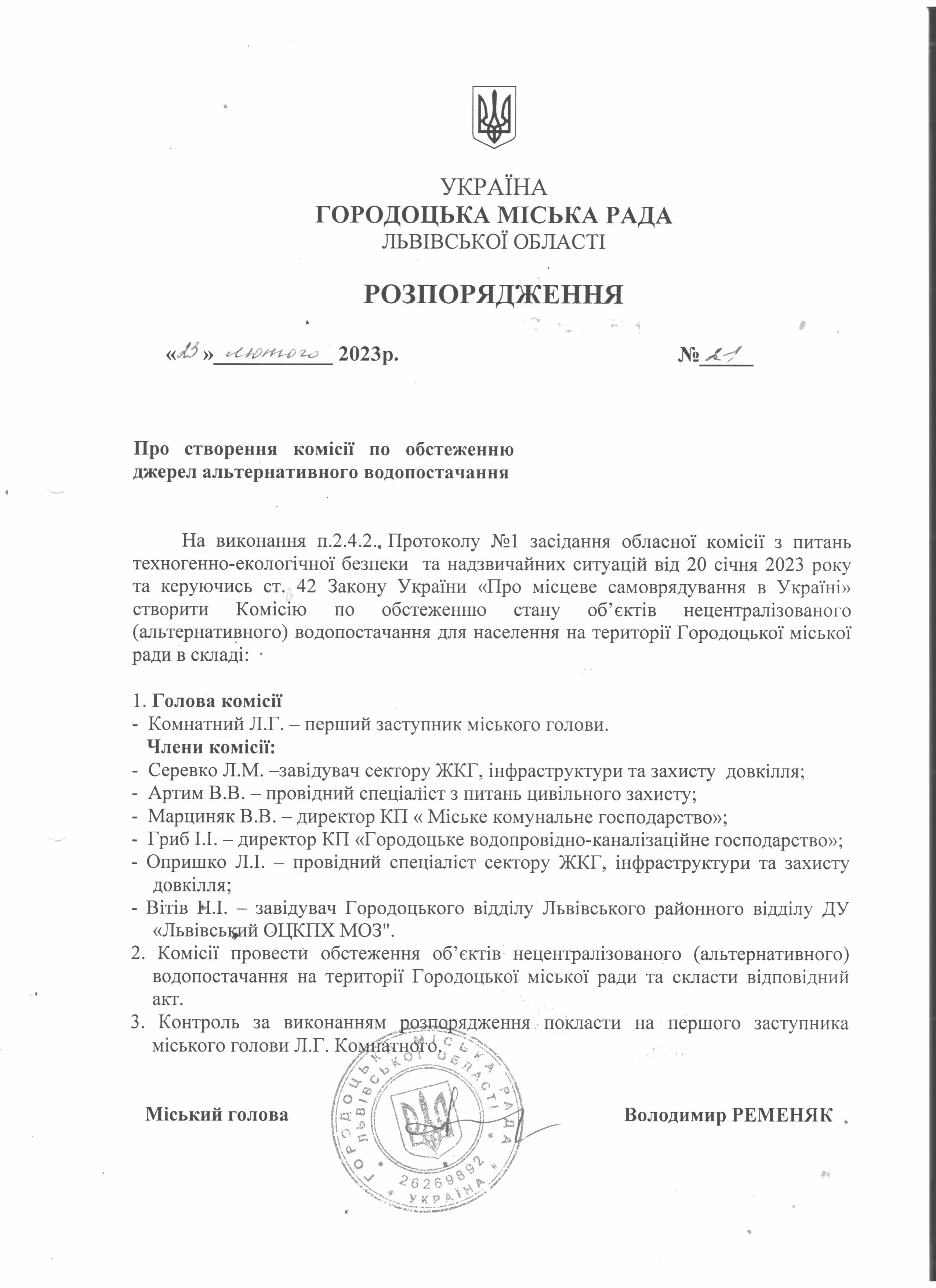 Розпорядження №21 від 23 лютого 2023 "Про створення комісії по обстеженню джерел альтернативного водопостачання" Файл: 21.jpeg