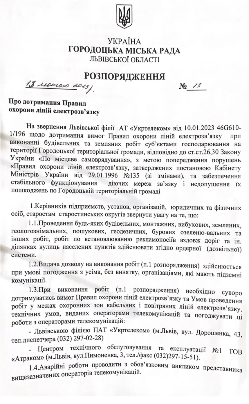 Розпорядження міського голови №13 від 13 лютого 2023 року "Про дотримання Правил охорони ліній електрозвʼязку" Файл: E2E9C82E-E888-4DD0-9597-6136EFB2B526.jpeg 29789F77-050F-4D09-9ACF-AE9491452537.jpeg