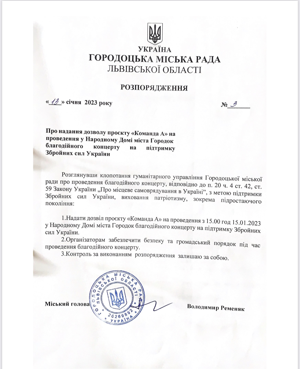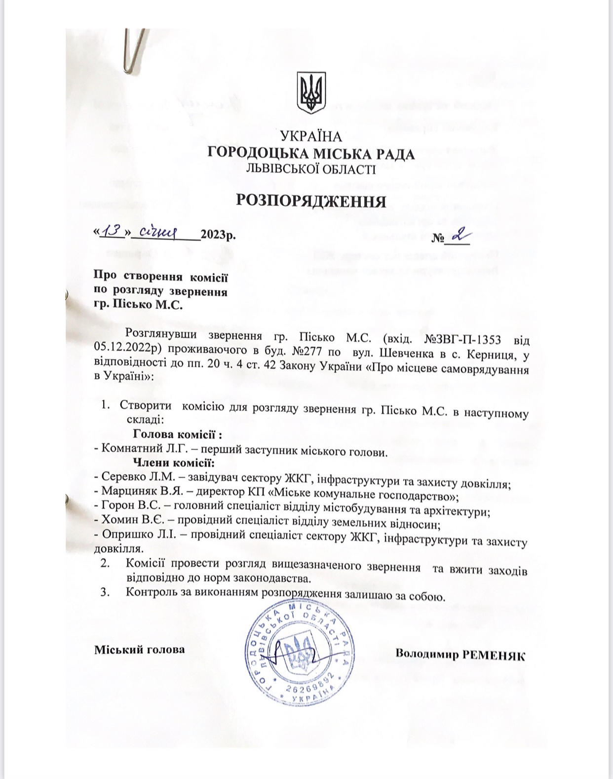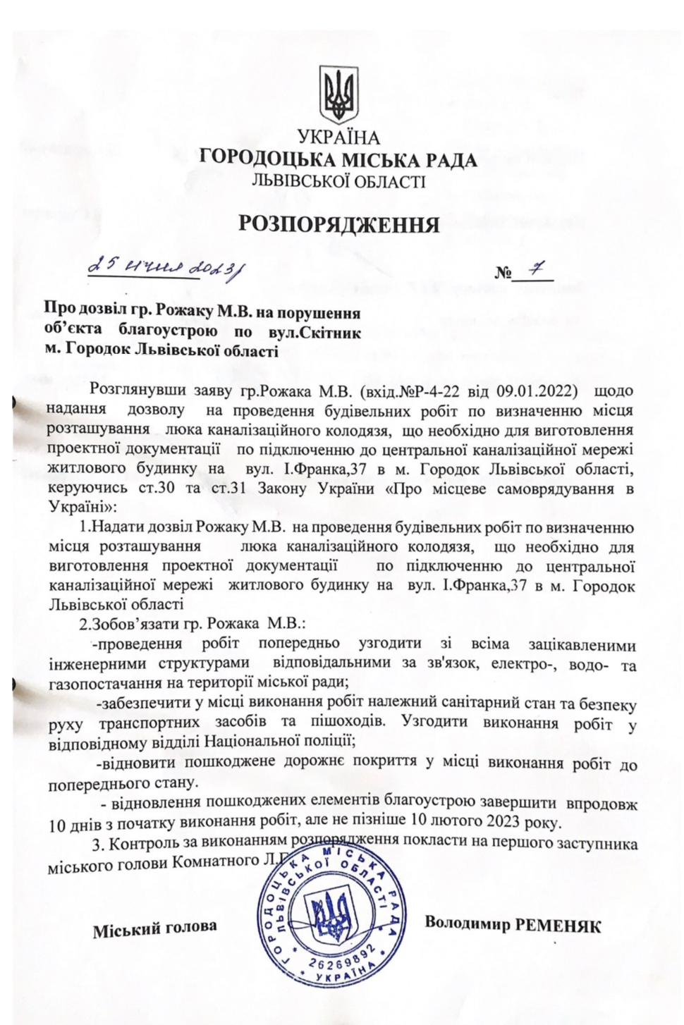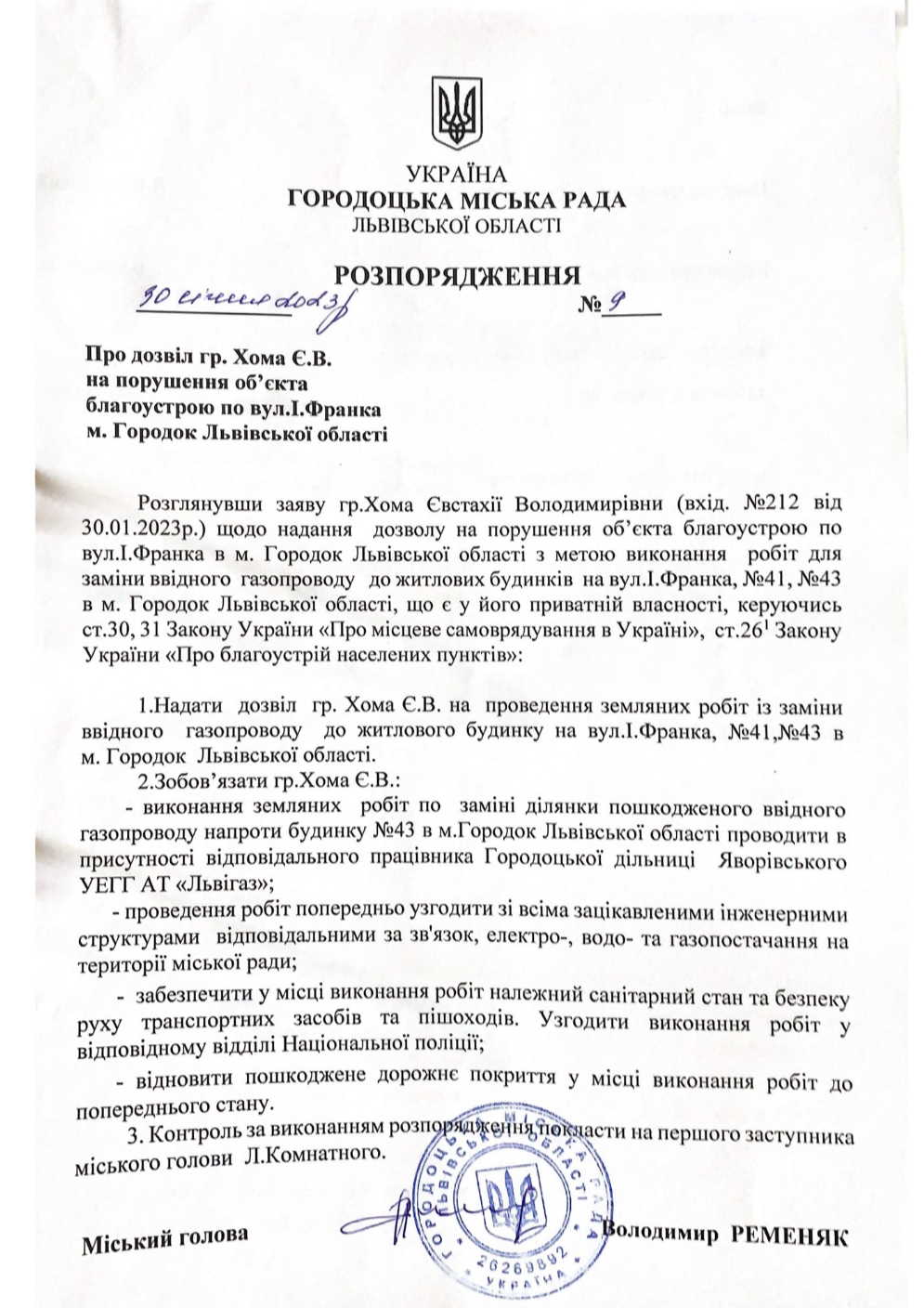 Розпорядження міського голови №9 від 30 січня 2023 року "Про дозвіл гр. Хома Є. В. на порушення об'єкта благоустрою по вул. І. Франка м. Городок Львівської області"