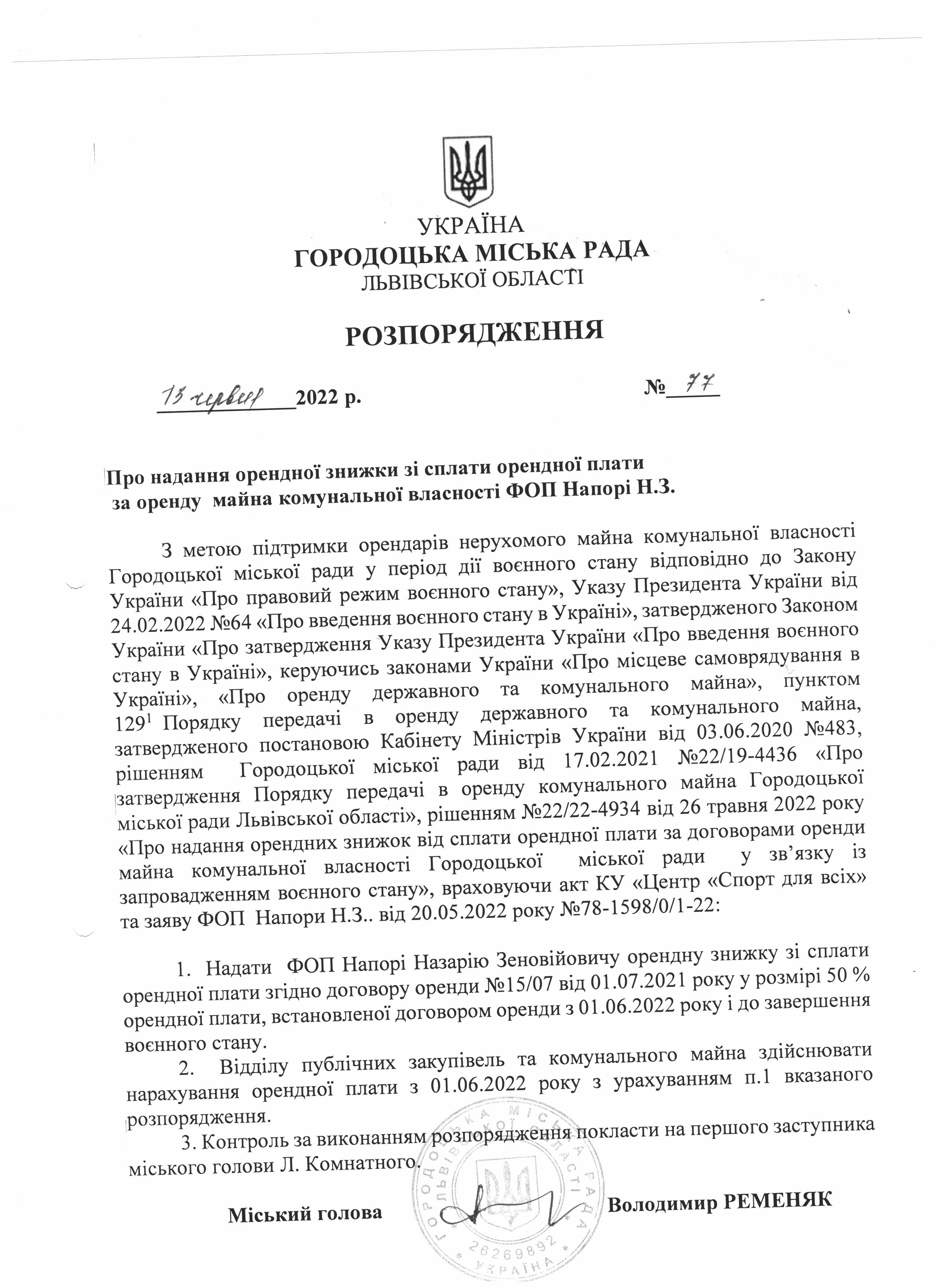 Розпорядження міського голови №77 від 13 червня 2022 року "Про надання орендної знижки зі сплати орендної плати за оренду майна комунальної власності ФОП Напорі Н.З."