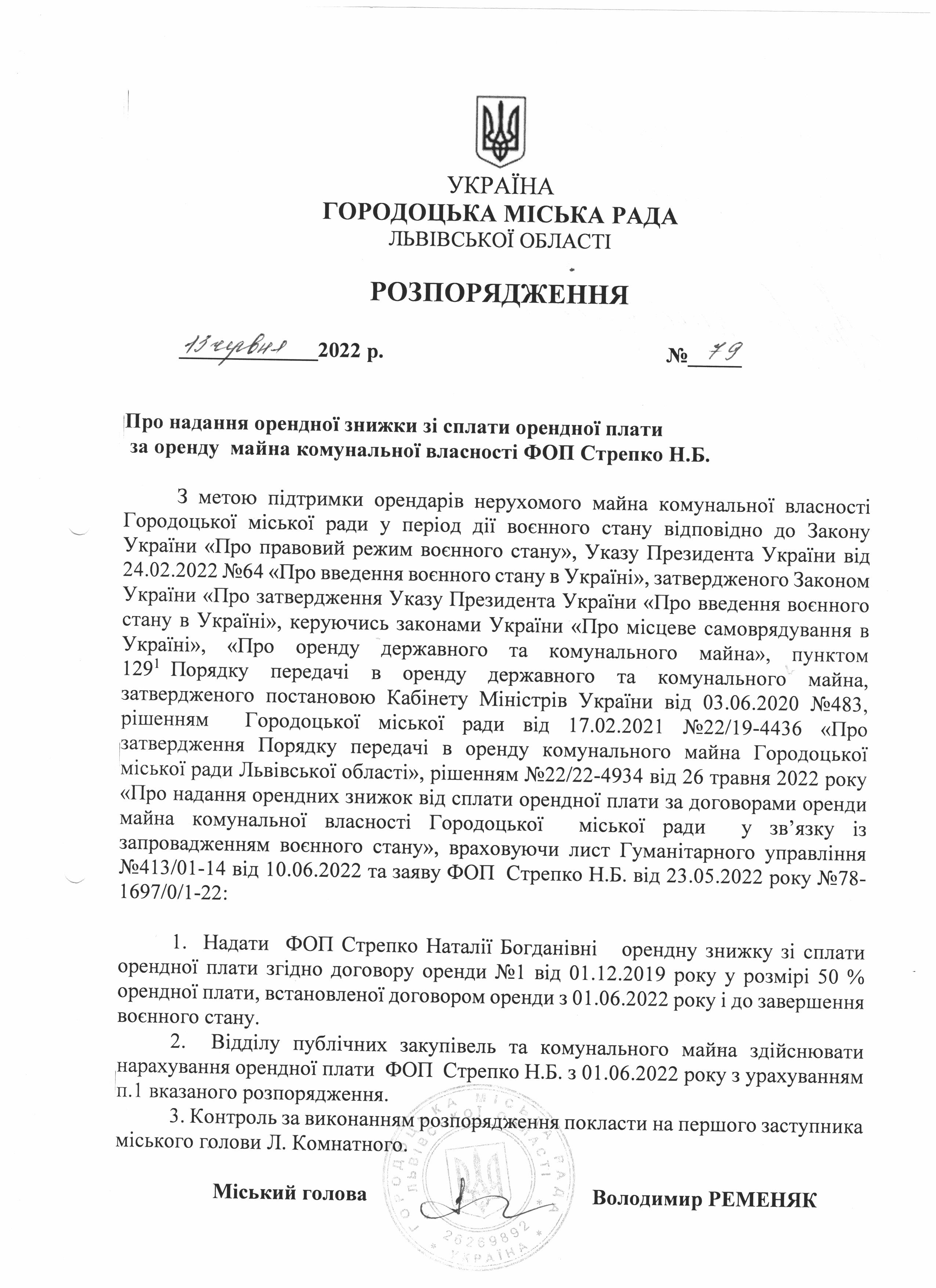 Розпорядження міського голови №79 від 13 червня 2022 року "Про надання орендної знижки зі сплати орендної плати за оренду майна комунальної власності ФОП Стрепко Н.Б."